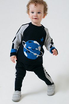Вязаный комплект для мальчика: джемпер с круглой горловиной и брюки. Джемпер украшен вывязанным узором с изображением планеты и полосками на рукавах. Спереди на плече застёгивается на две пуговицы. Горловина, манжеты и пояс связаны ластиком. Брюки с эластичной резинкой в поясе украшены контрастными полосами по бокам, манжеты выполнены ластиком.