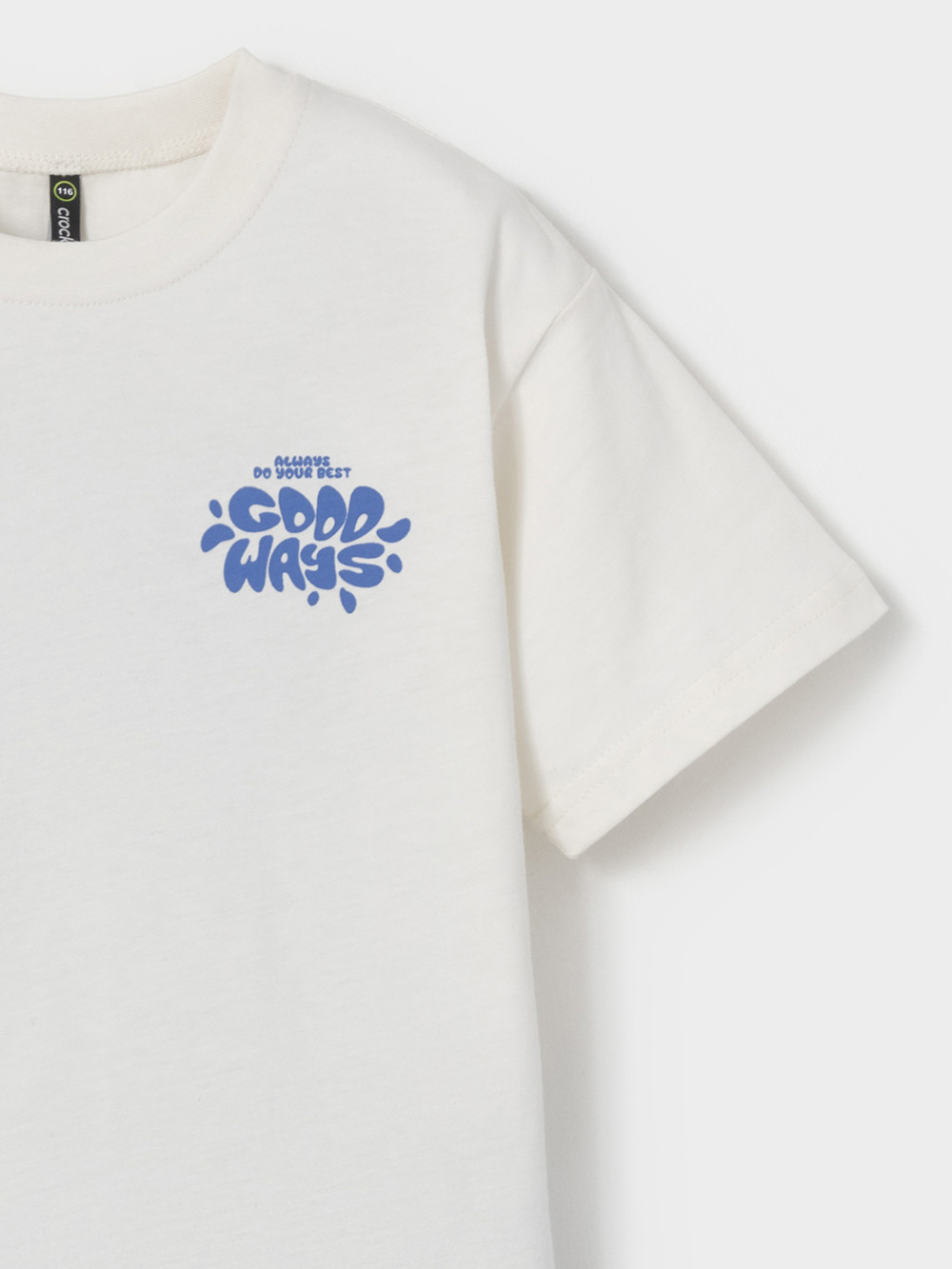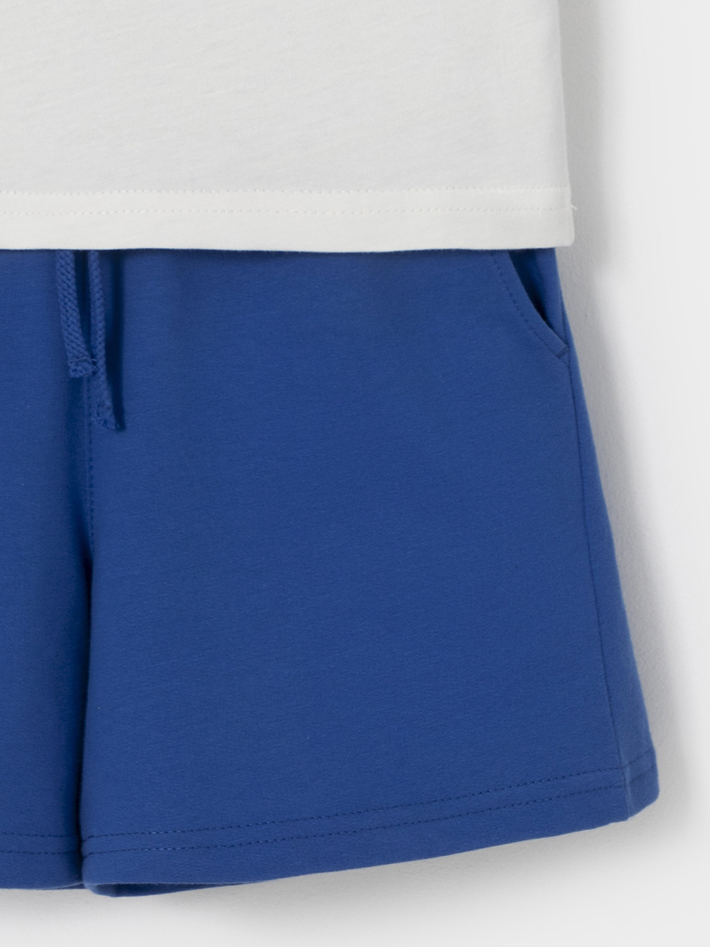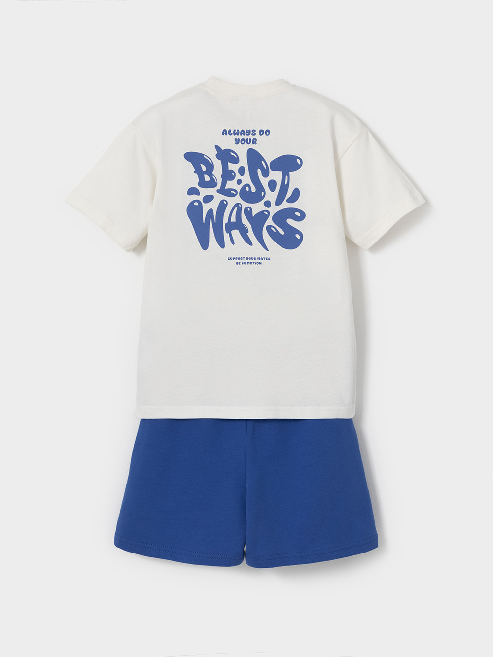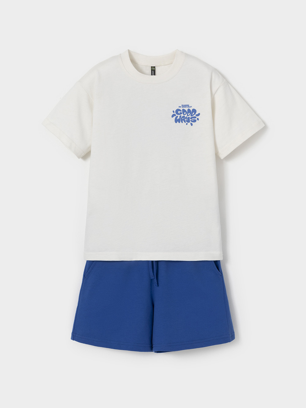 Набор трикотажный для мальчика: футболка с короткими спущенными рукавами и свободные шорты. Комплект изготовлен из гладкого трикотажа супрем, который произведён из 100% натурального хлопка высокого качества. Изделия отлично дышат, а свободный крой не стесняет движения, поэтому футболка и шорты комфортны для активных игр, отдыха и занятий спортом. Оригинальный принт выполнен из стойких текстильных гипоаллергенных красителей. Комплект сохраняет цвет и форму после многократных стирок. Все трикотажные полотна производятся в соответствии с нормами швейцарского сертификата ЭкоТекс.