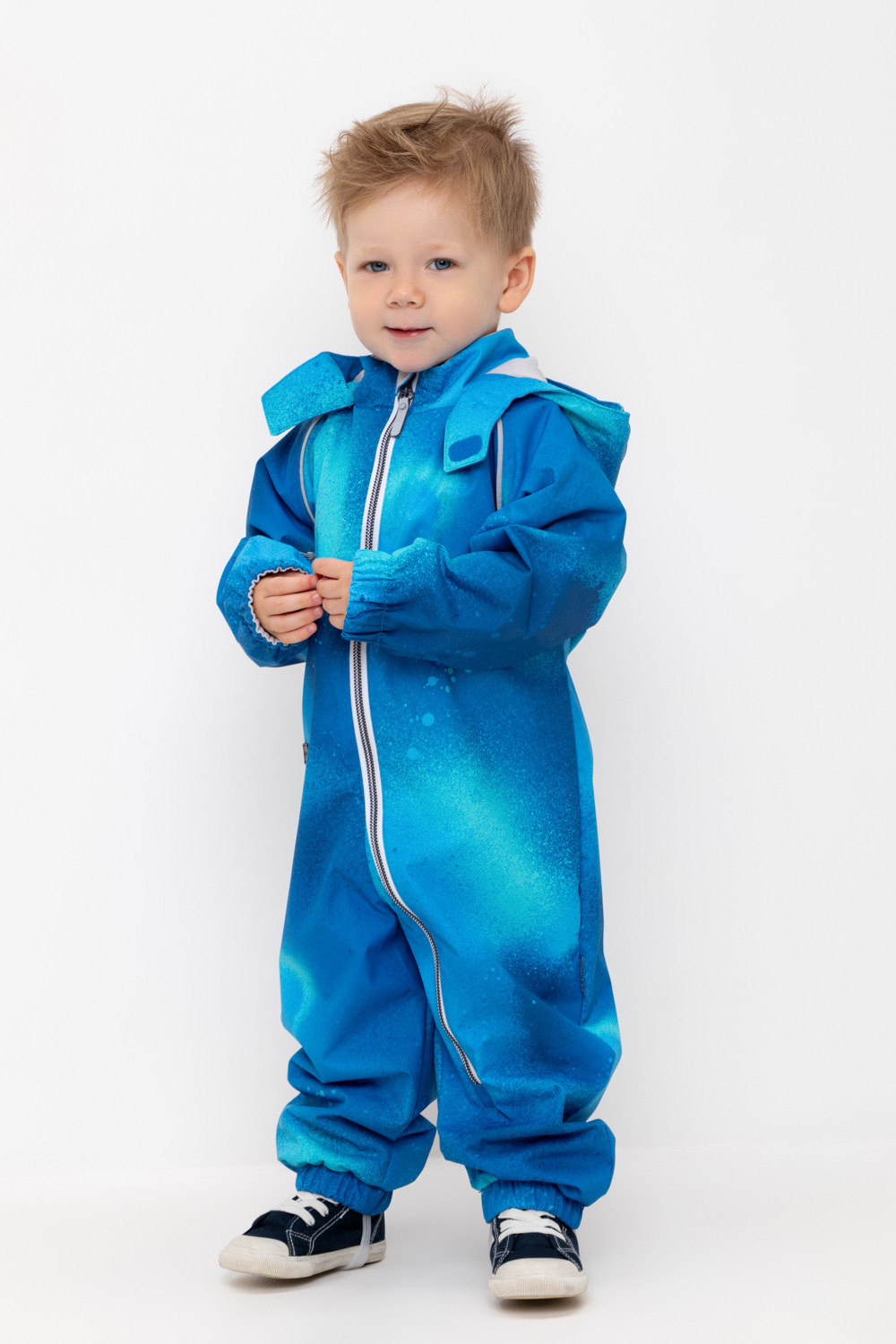 Ветровочный комбинезон ясельный из мембранной ткани с дополнительной тефлоновой обработкой. Данный вид обработки предохраняет изделие от загрязнения и лучше отводит влагу. Подклад из 100% хлопка. У изделия удлиненная молния для легкого одевания с защитой подбородка. Утяжка на капюшоне с потайными стопперами. По низу рукавов и брючин, а также на спинке изделия эластичная резинка для лучшего прилегания. Для фиксации комбинезона используются съемные силиконовые штрипки. В размерах  74-80 функциональные отвороты на рукавах и брючинах. Во всех изделиях верхнего ассортимента для безопасности ребенка предусмотрены светоотражающие элементы.
