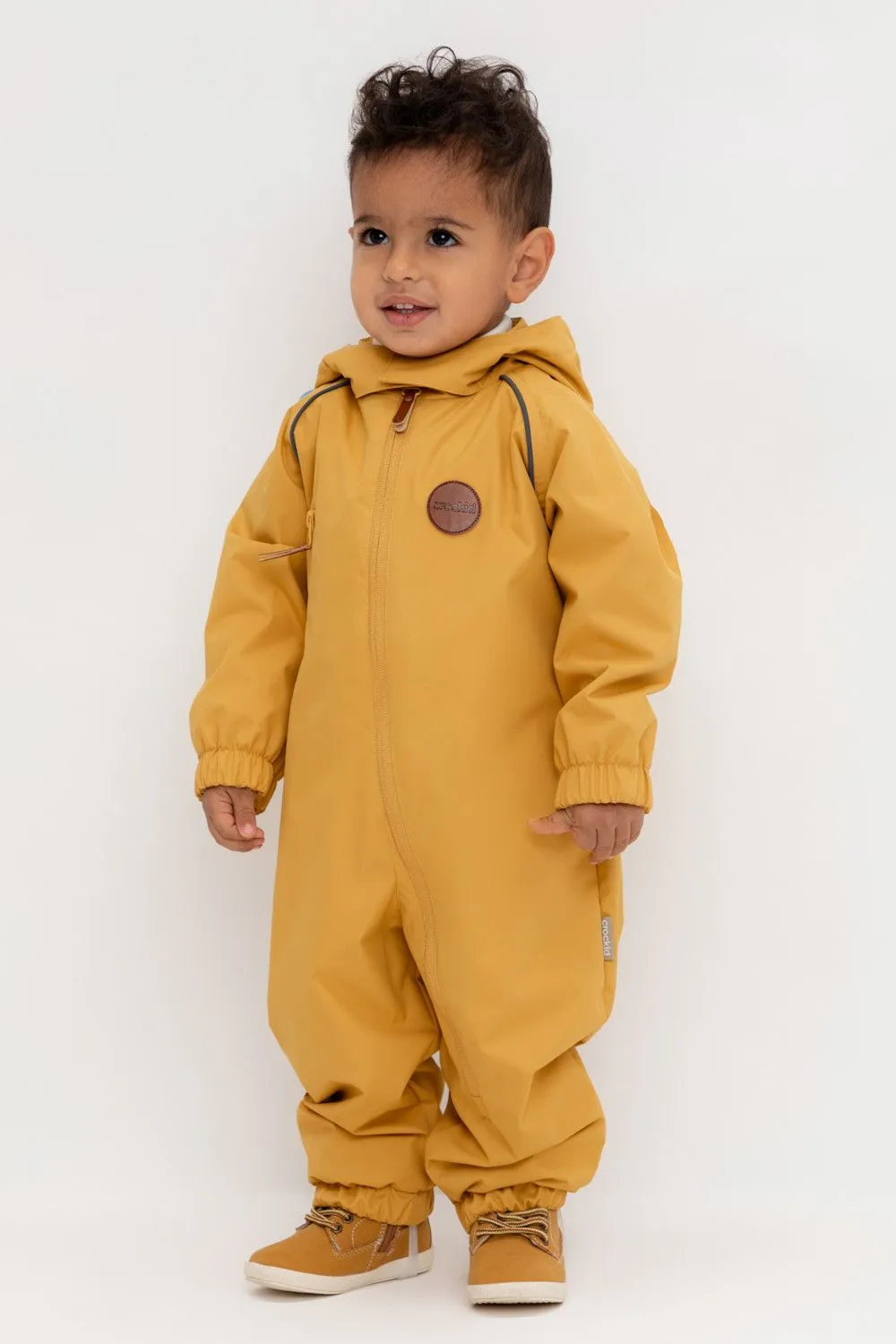 Ветровочный комбинезон ясельный из мембранной ткани с дополнительной тефлоновой обработкой. Данный вид обработки предохраняет изделие от загрязнения и лучше отводит влагу. Подклад из 100% хлопка. У изделия удлиненная молния для легкого одевания с защитой подбородка. Утяжка на капюшоне с потайными стопперами. По низу рукавов и брючин, а также на спинке изделия эластичная резинка для лучшего прилегания. Для фиксации комбинезона используются съемные силиконовые штрипки. В размерах 68-74 и 74-80 функциональные отвороты на рукавах и брючинах. Во всех изделиях верхнего ассортимента для безопасности ребенка предусмотрены светоотражающие элементы.