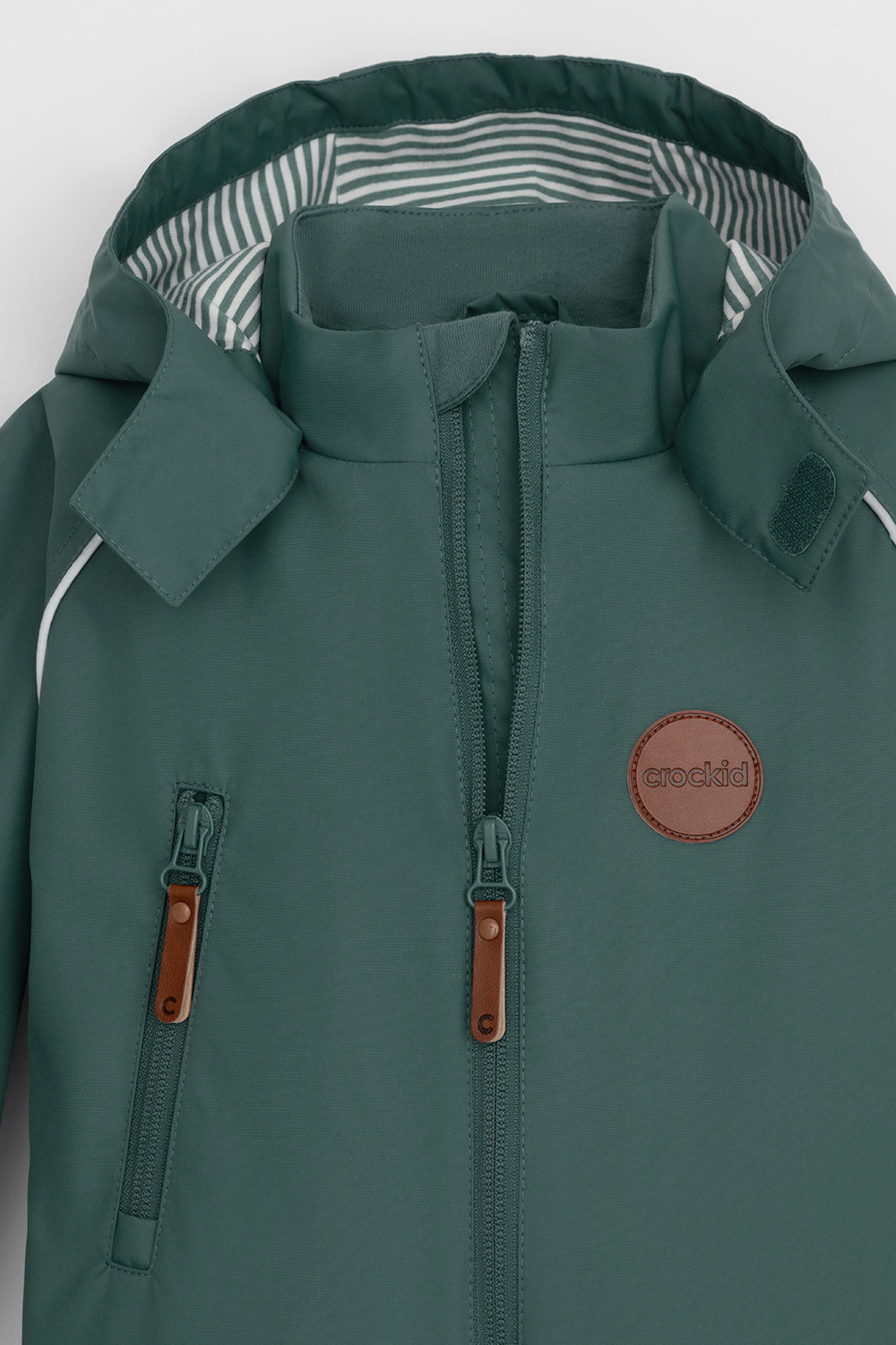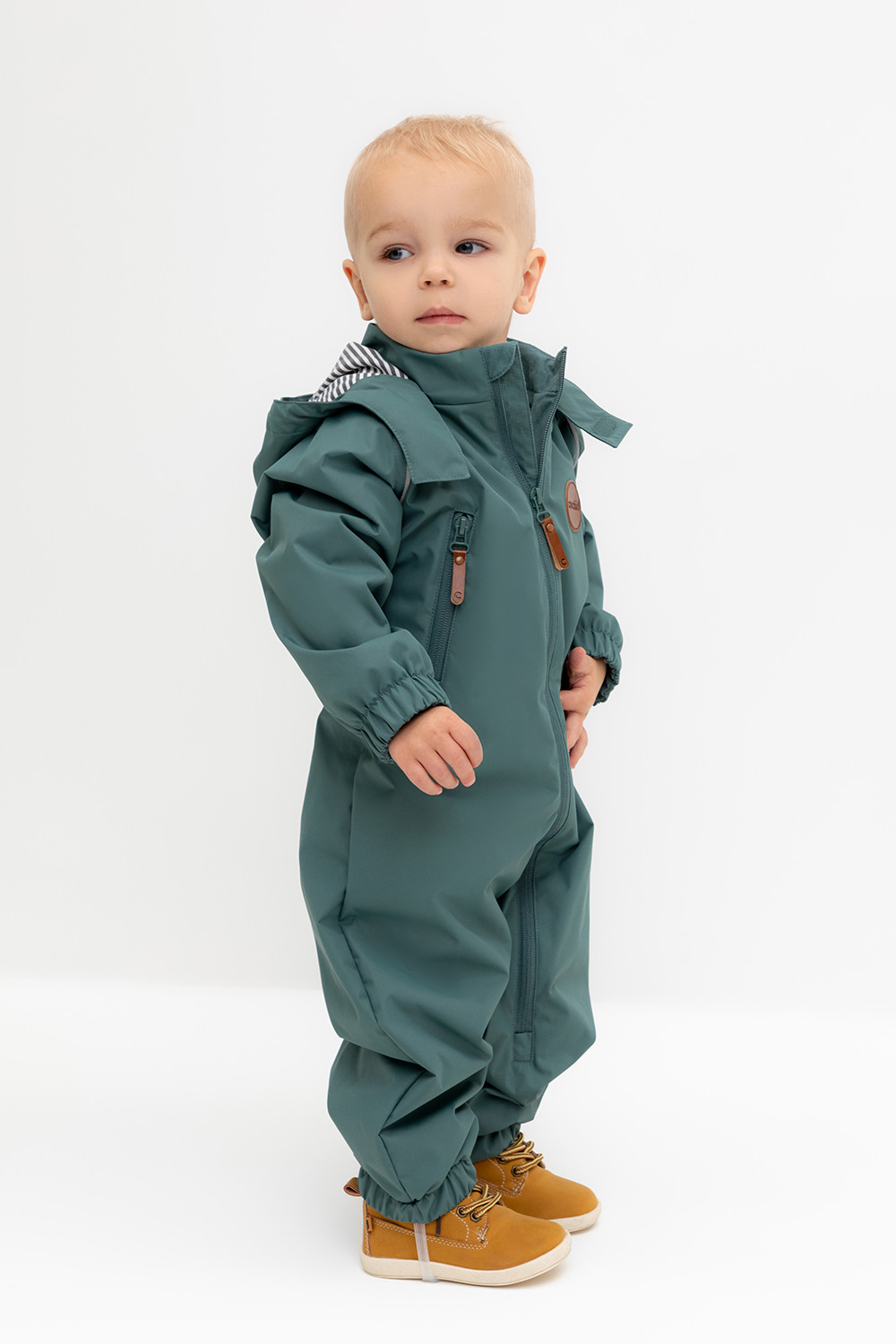 Ветровочный комбинезон ясельный из мембранной ткани с дополнительной тефлоновой обработкой. Данный вид обработки предохраняет изделие от загрязнения и лучше отводит влагу. Подклад из 100% хлопка. У изделия удлиненная молния для легкого одевания с защитой подбородка. Утяжка на капюшоне с потайными стопперами. По низу рукавов и брючин, а также на спинке изделия эластичная резинка для лучшего прилегания. Для фиксации комбинезона используются съемные силиконовые штрипки. В размерах 68-74 и 74-80 функциональные отвороты на рукавах и брючинах. Во всех изделиях верхнего ассортимента для безопасности ребенка предусмотрены светоотражающие элементы.