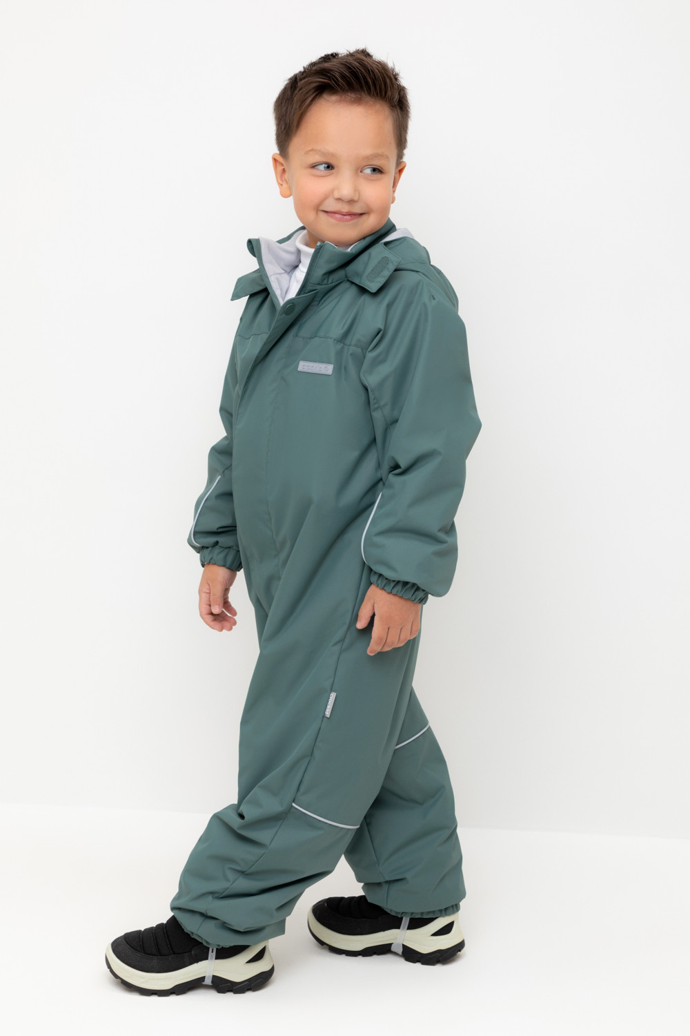 Демисезонный комбинезон для мальчика с утеплителем SEE, 120 г/м2. Выполнен из мембранной ткани с дополнительной тефлоновой обработкой. Данный вид обработки предохраняет изделие от загрязнения и лучше отводит влагу. Подклад из 100% полиэстера. Для удобного одевания комбинезон застёгивается на удлинённую молнию с защитой подбородка и имеет дополнительную ветрозащитную планку на липучках и кнопках. Капюшон не снимается, по верхнему краю есть эластичная вставка. По низу рукавов и брючин, а также на спинке изделия предусмотрены эластичные резинки для лучшего прилегания. Для фиксации комбинезона используются съёмные силиконовые штрипки. Во всех изделиях верхнего ассортимента для безопасности ребёнка предусмотрены светоотражающие элементы.