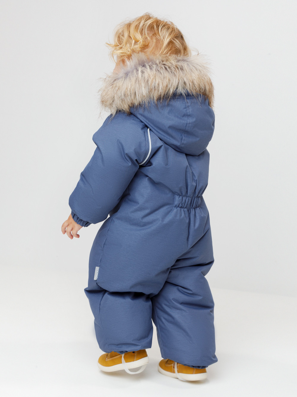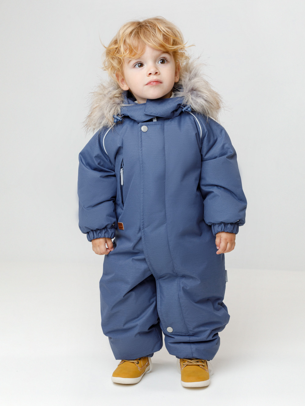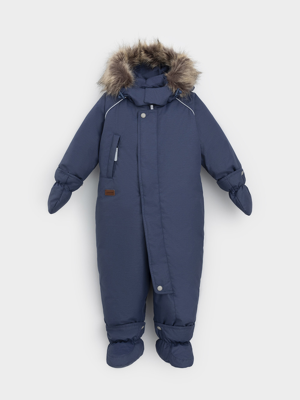 Зимний комбинезон ясельный с натуральным утеплителем из гусиного пуха (70%) и пера (30%). Выполнен из мембранной ткани с дополнительной тефлоновой обработкой, которая предохраняет изделие от загрязнений и отталкивает влагу. Подклад выполнен из 100% хлопка. Комбинезон застёгивается на молнию и внешнюю планку на липучках, предусмотрена защита подбородка. Несъёмный капюшон имеет эластичную утяжку со стопперами и отстёгивающийся мех на молнии. Резинка по спинке для лучшего прилегания. На груди карман на молнии. По рукавам и низу изделия эластичные манжеты, на ножках отстёгивающиеся силиконовые штрипки. В размерах с 68-74 по 80-86 в комплекте идут рукавицы и пинетки. Во всех изделиях верхнего ассортимента для безопасности ребёнка предусмотрены светоотражающие элементы.