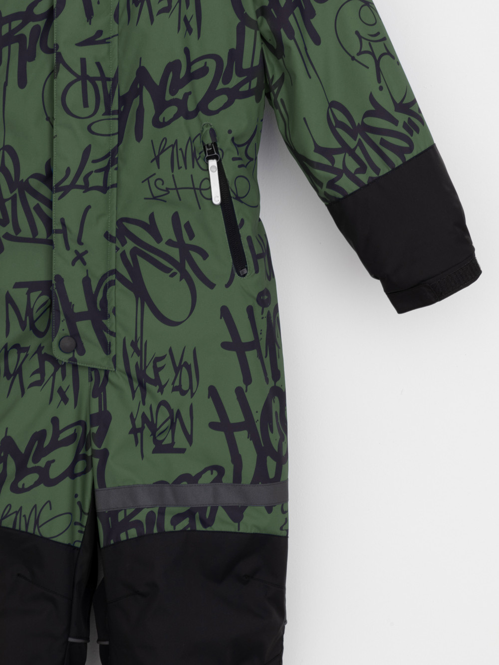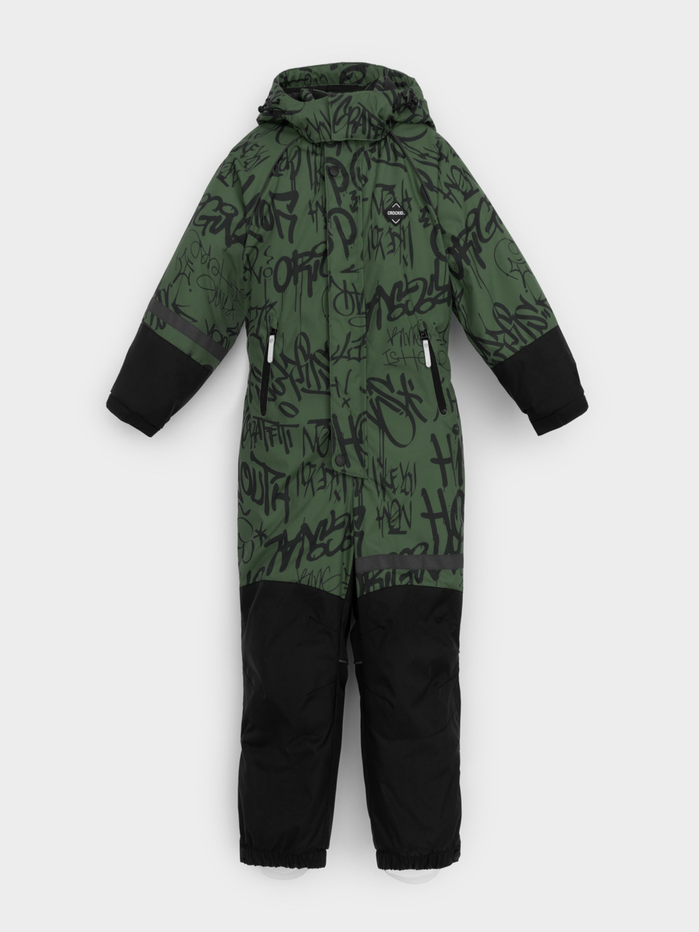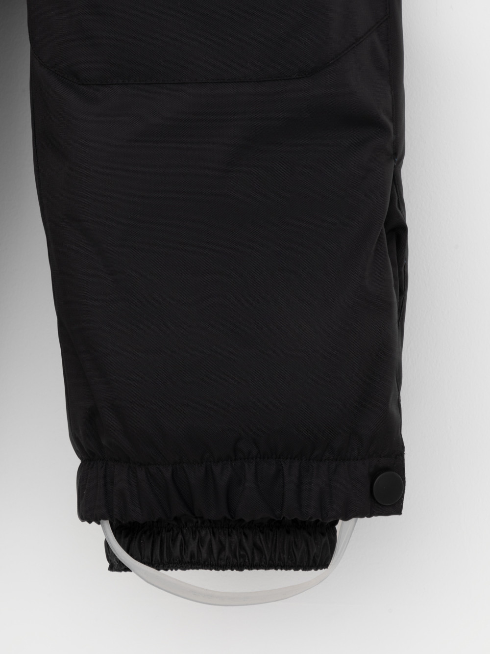 Зимний комбинезон для мальчика с утеплителем Fellex®: 250 г/м2 . Выполнен из мембранной ткани с дополнительной тефлоновой обработкой, которая предохраняет изделие от загрязнений и отталкивает влагу. Подклад выполнен из 100% полиэстера Tricot. Комбинезон застёгивается на молнию и внешнюю планку на липучках и кнопках, предусмотрена защита подбородка. Съёмный капюшон имеет эластичную утяжку со стопперами. Резинка по спинке обеспечивает лучшее прилегание. По бокам два кармана на молнии. Эластичные манжеты на рукавах  регулируются по ширине с помощью липучки, по низу изделия - с помощью кнопки. Внутренняя противоснежная юбка защищает обувь от попадания снега и удерживает комбинезон в закреплённом положении, предусмотрены отстёгивающиеся штрипки. Во всех изделиях верхнего ассортимента для безопасности ребёнка предусмотрены светоотражающие элементы.