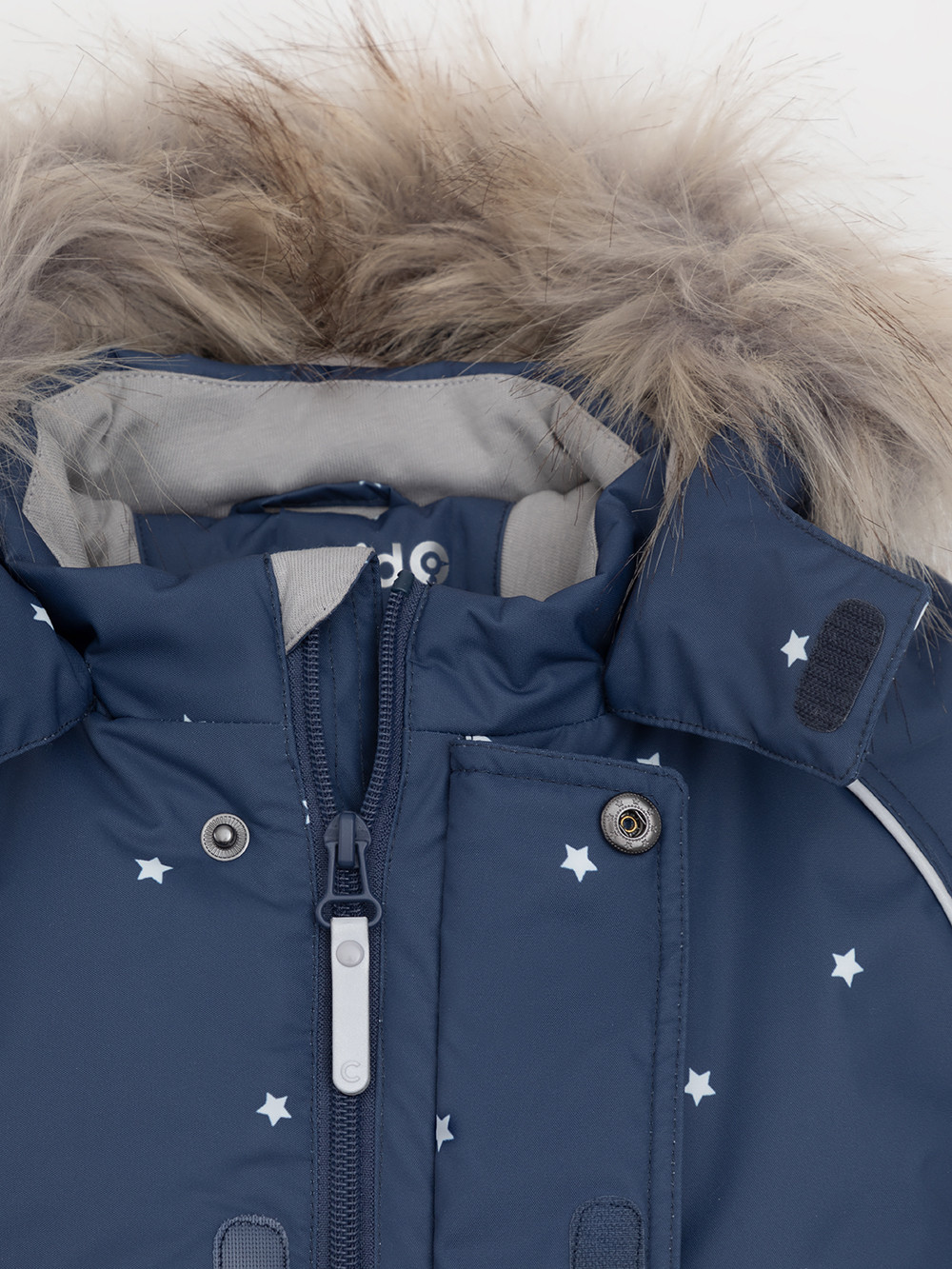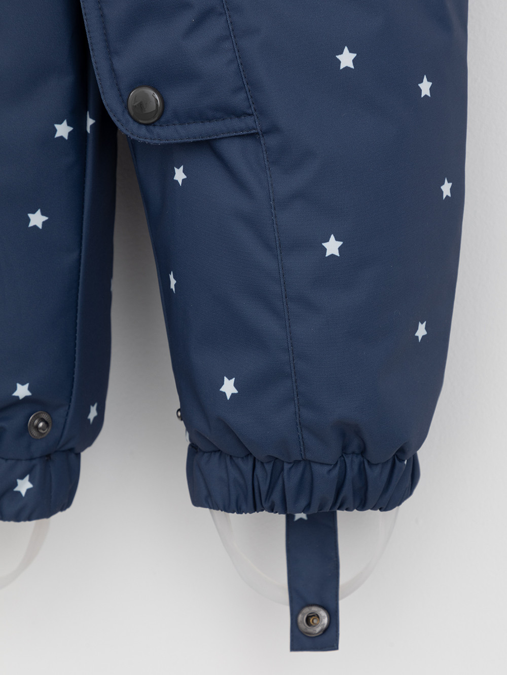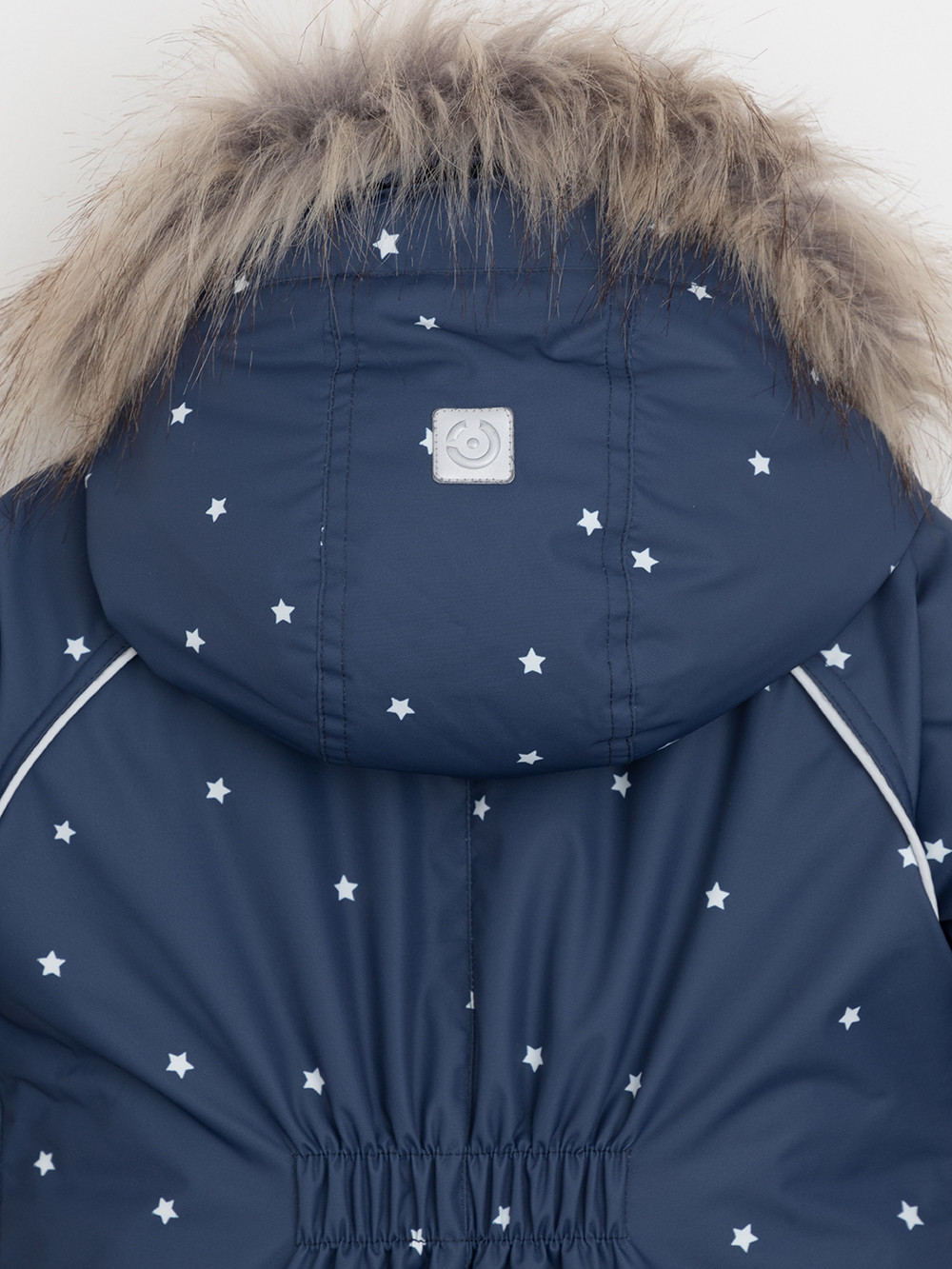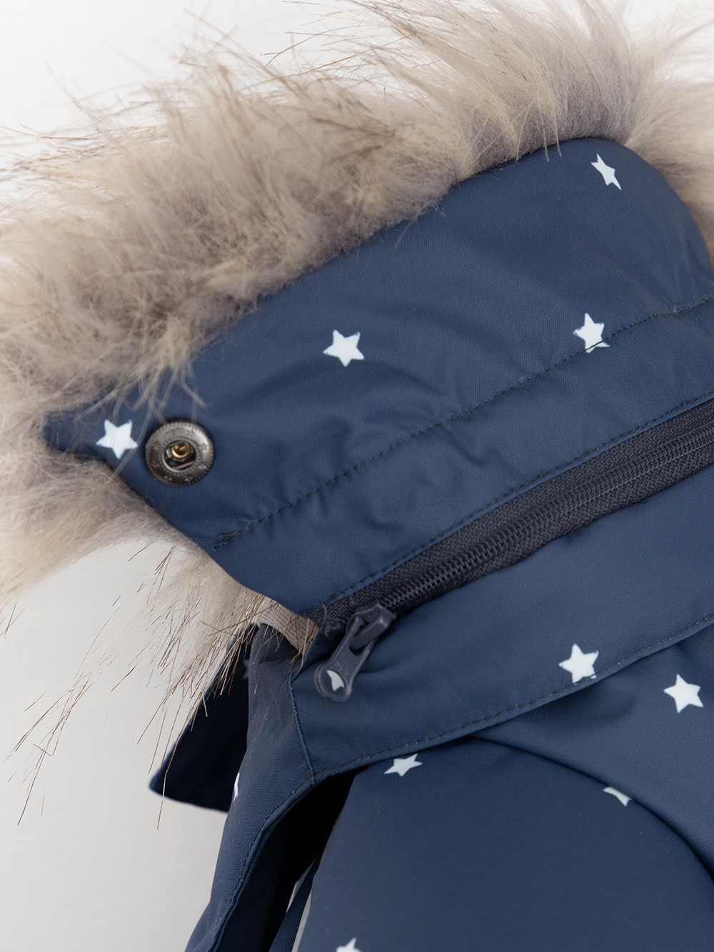 Зимний комбинезон ясельный с утеплителем Fellex®: 300 г/м2. Выполнен из мембранной ткани с дополнительной тефлоновой обработкой, которая предохраняет изделие от загрязнений и отталкивает влагу. Подклад выполнен из 100% хлопка. Комбинезон застёгивается на молнию и внешнюю планку на липучках, предусмотрена защита подбородка. Несъёмный капюшон имеет эластичную утяжку со стопперами и отстёгивающийся мех на молнии. Резинка по спинке для лучшего прилегания. На груди карман на молнии. По рукавам и низу изделия эластичные манжеты, на ножках отстёгивающиеся силиконовые штрипки. В размерах 74-80 и 80-86 в комплекте идут рукавицы и пинетки. Во всех изделиях верхнего ассортимента для безопасности ребёнка предусмотрены светоотражающие элементы.