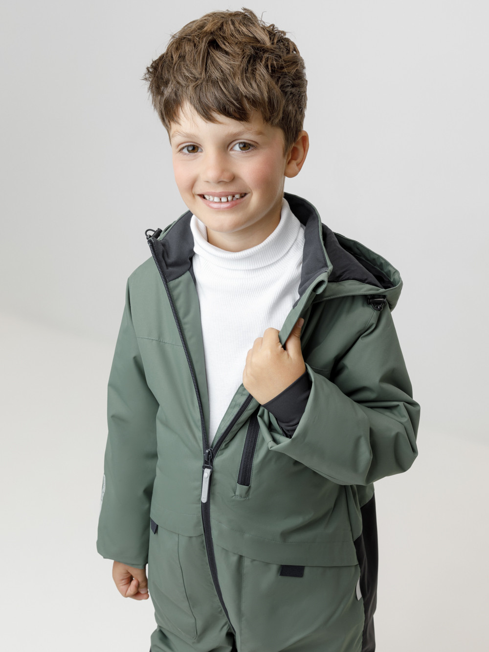 Демисезонный комбинезон для мальчика с утеплителем Fellex®, 120 г/м2. Выполнен из мембранной ткани с дополнительной тефлоновой обработкой. Данный вид обработки предохраняет изделие от загрязнения и лучше отводит влагу. Подклад из 100% полиэстера. Для удобного одевания комбинезон застёгивается на удлинённую молнию с защитой подбородка. Капюшон не снимается, по бокам эластичная утяжка со стопперами. Внутри рукавов мягкие манжеты из лайкры. По низу и по спинке изделия предусмотрены эластичные резинки для лучшего прилегания. Для фиксации комбинезона используются съёмные силиконовые штрипки. Во всех изделиях верхнего ассортимента для безопасности ребёнка предусмотрены светоотражающие элементы.