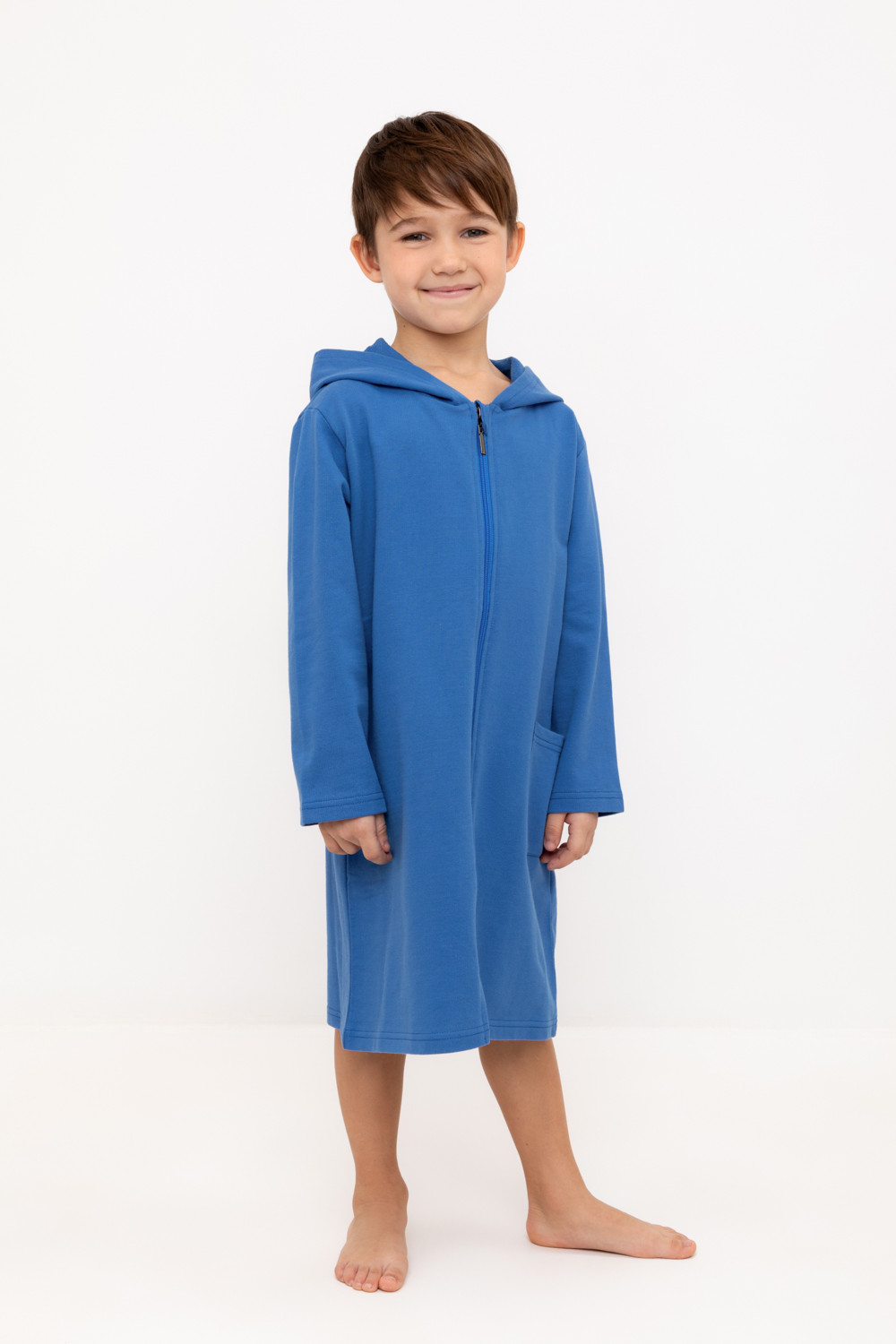 Халат с тонким капюшоном из мягкого набивного трикотажа футер петля. Застёгивается на молнию, предусмотрена мягкая защита подбородка. Накладной карман уходит в шов.
