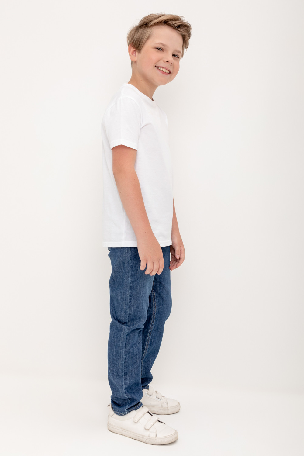 Классические прямые джинсы с потертостями. Застёгиваются на молнию в размерах 110-152. Застежка на крючок без молнии в размере 104. Внутренняя эластичная утяжка по талии. Предусмотрены шлёвки, в которые можно вставить ремень. Впереди и сзади карманы.