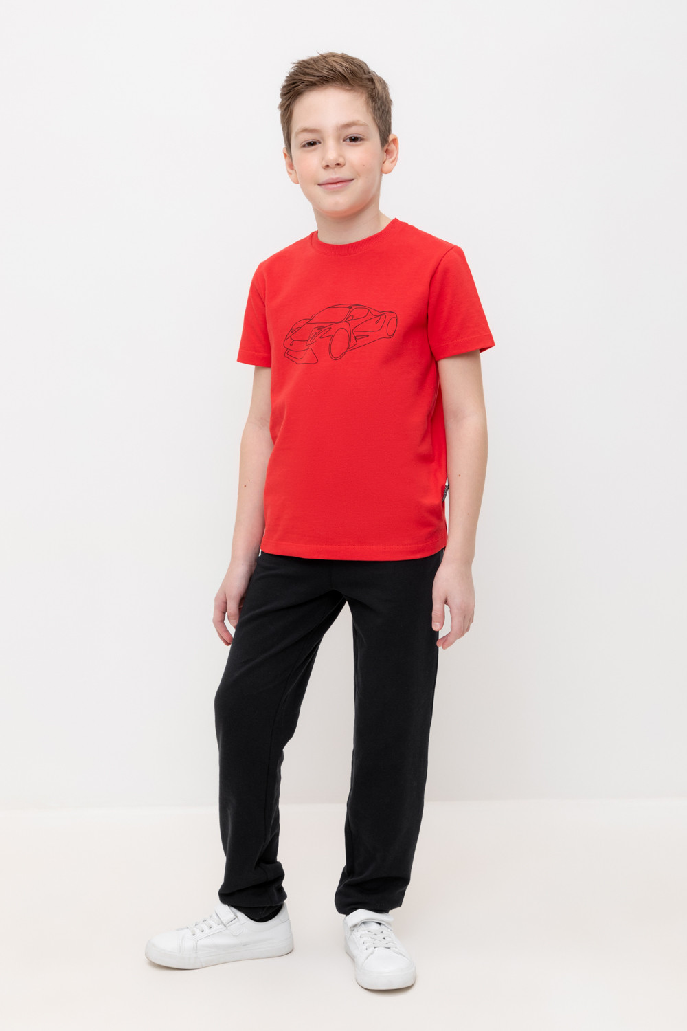 Трикотажные брюки для мальчика из петельчатого футера. Эластичный пояс на резинке регулируется по ширине с помощью шнурка, по бокам два удобных кармана, внизу эластичные манжеты.