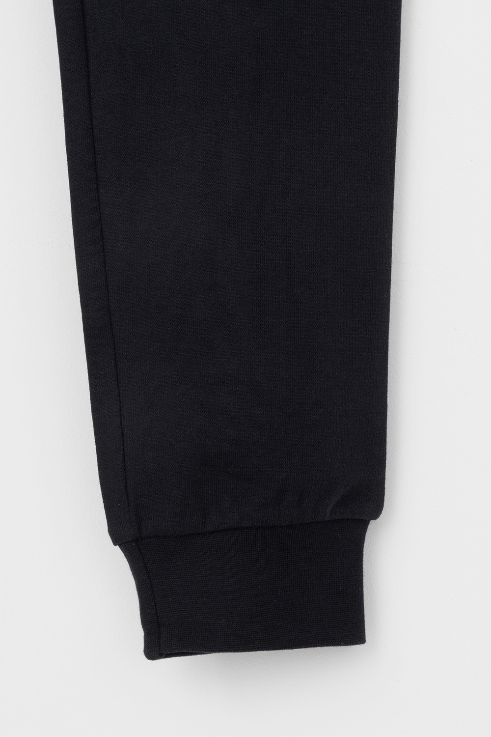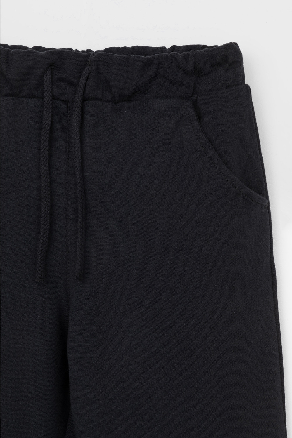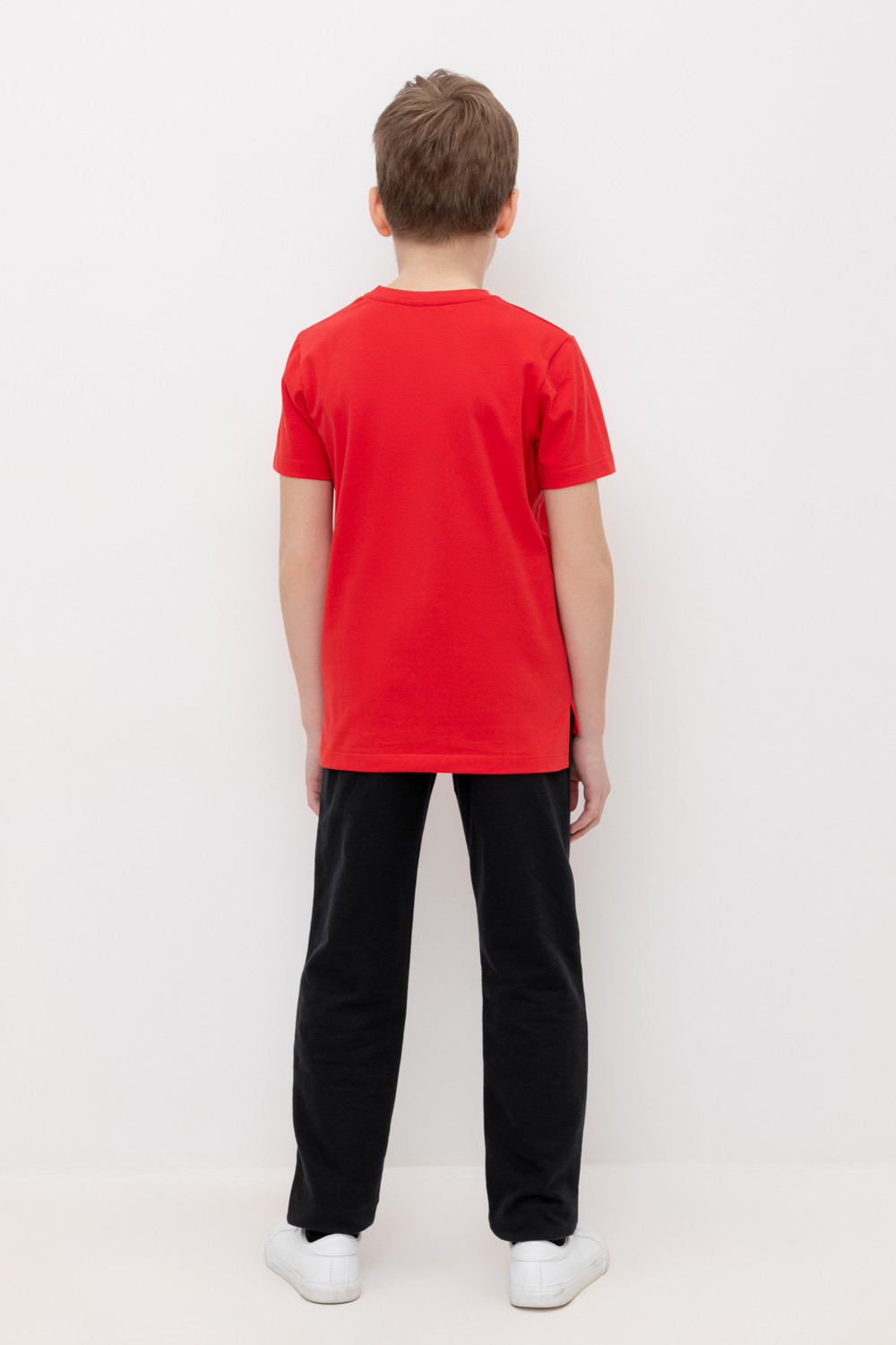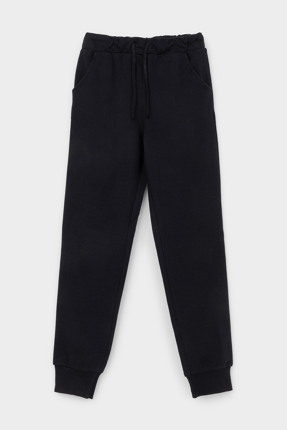 Трикотажные брюки для мальчика из петельчатого футера. Эластичный пояс на резинке регулируется по ширине с помощью шнурка, по бокам два удобных кармана, внизу эластичные манжеты.