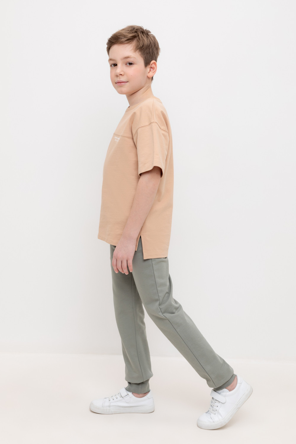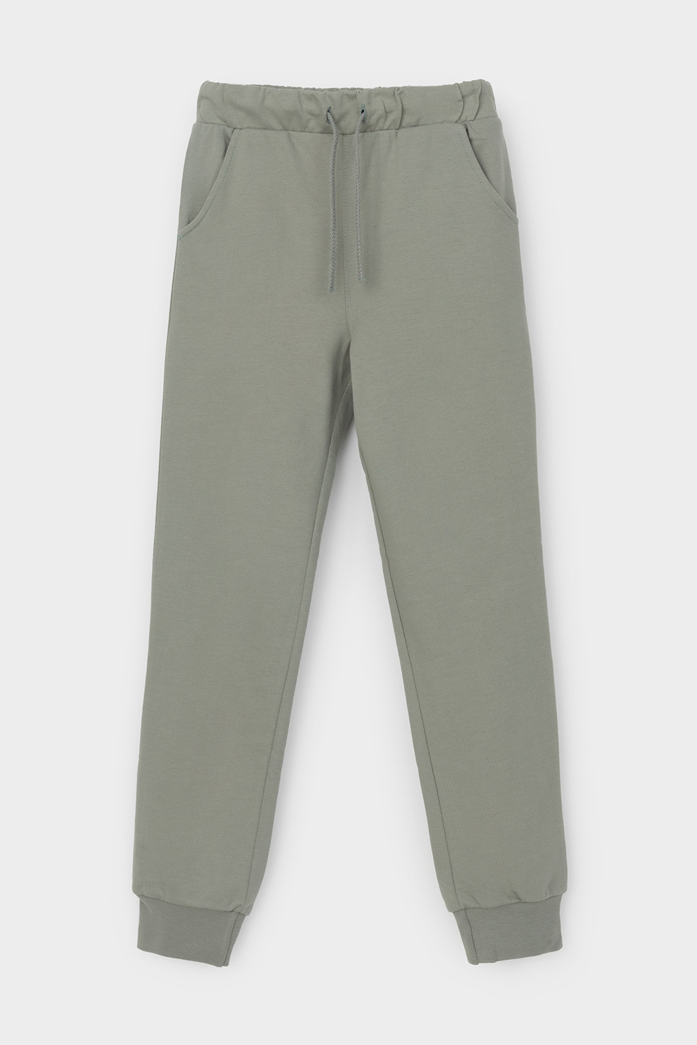 Трикотажные брюки для мальчика из петельчатого футера. Эластичный пояс на резинке регулируется по ширине с помощью шнурка, по бокам два удобных кармана, внизу эластичные манжеты.
