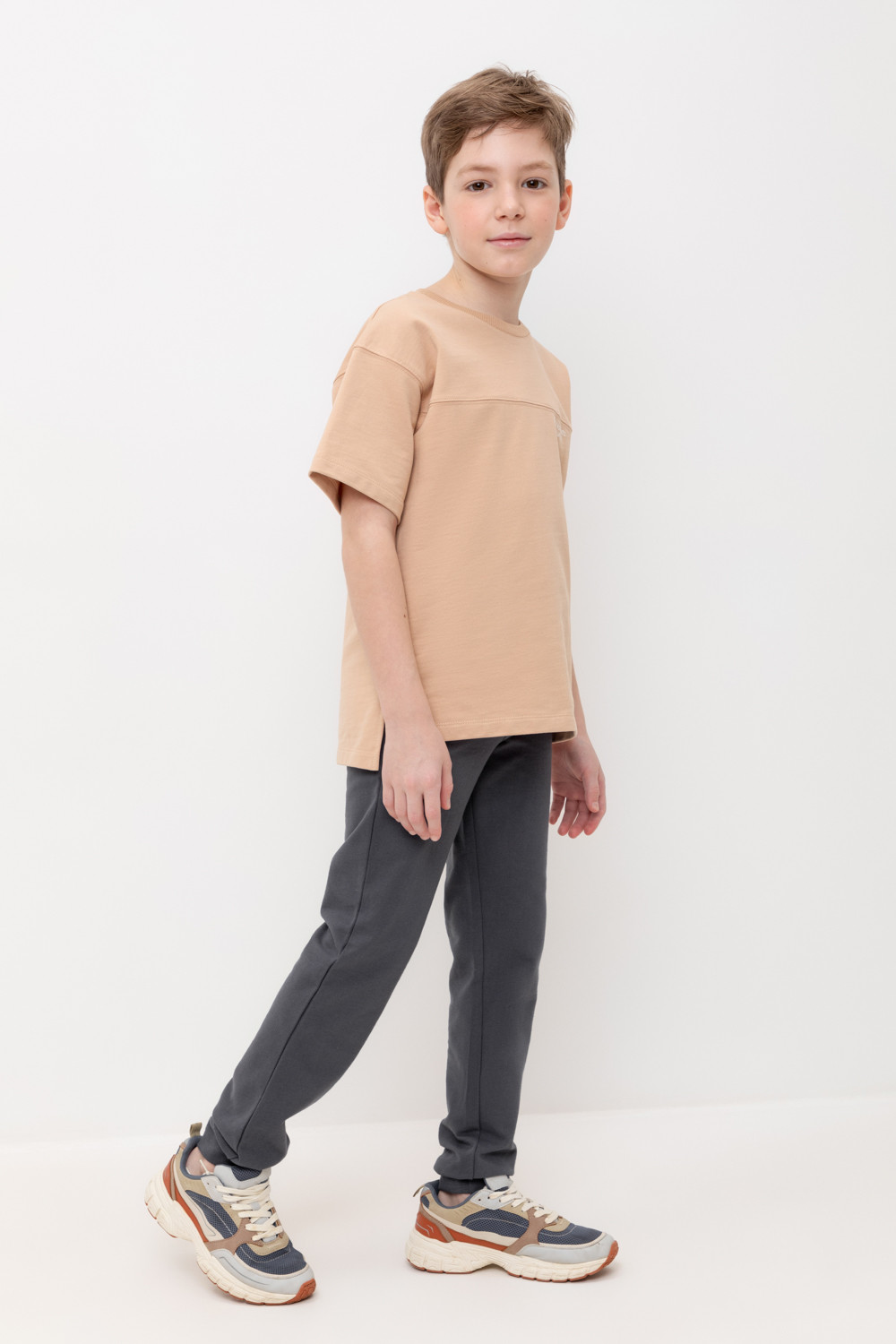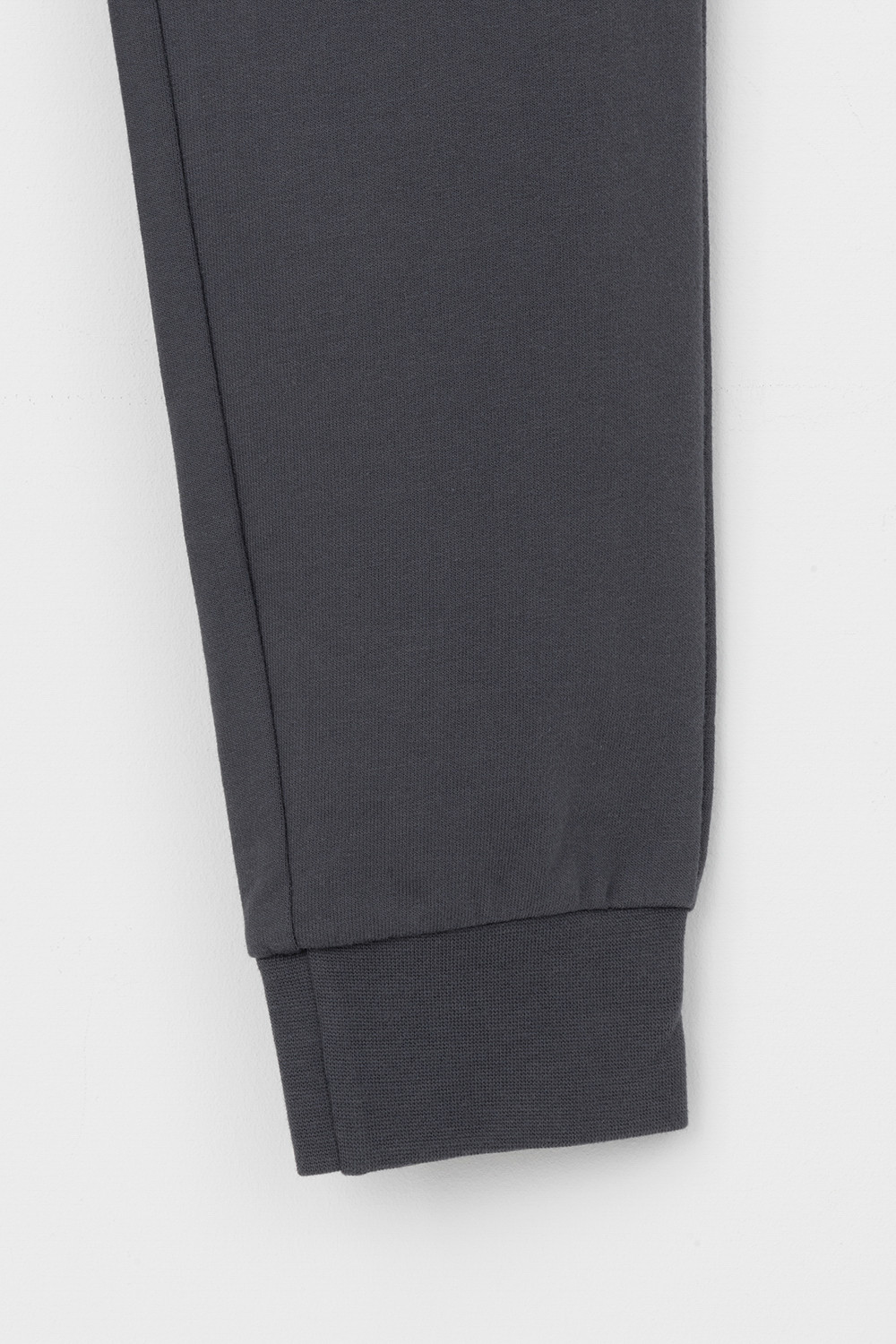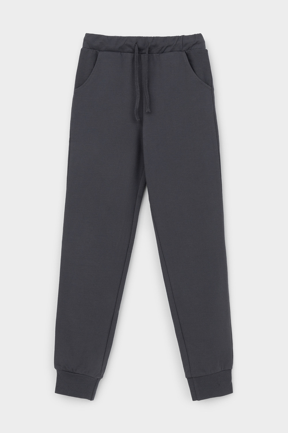 Трикотажные брюки для мальчика из петельчатого футера. Эластичный пояс на резинке регулируется по ширине с помощью шнурка, по бокам два удобных кармана, внизу эластичные манжеты.