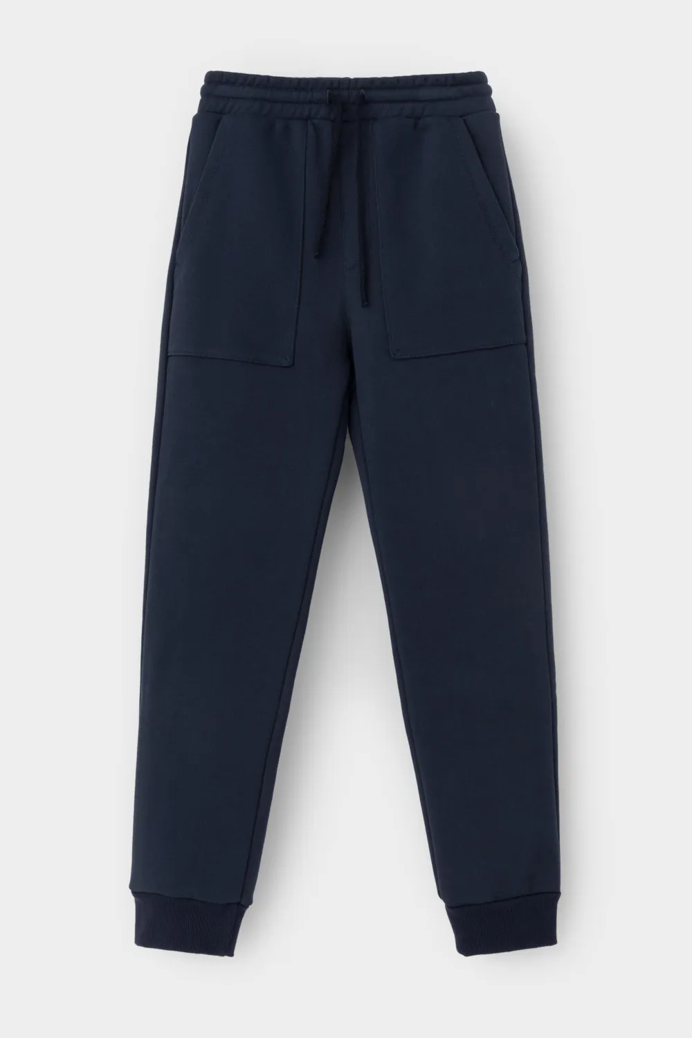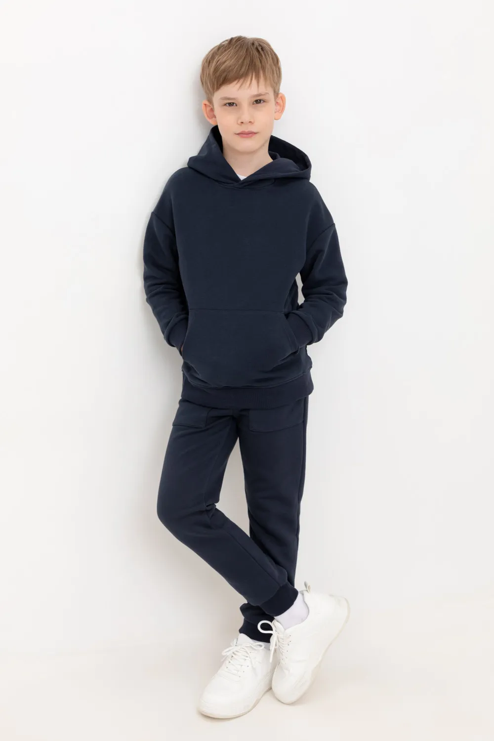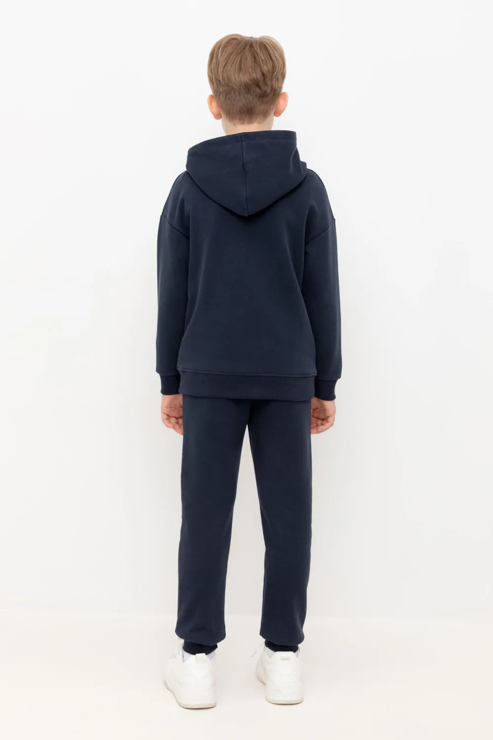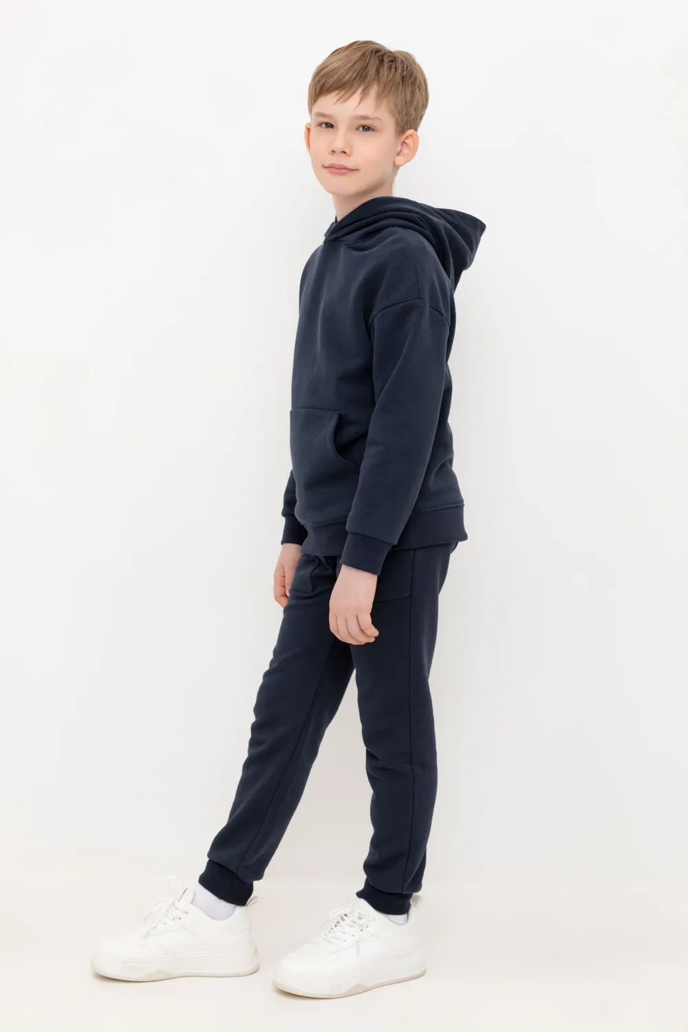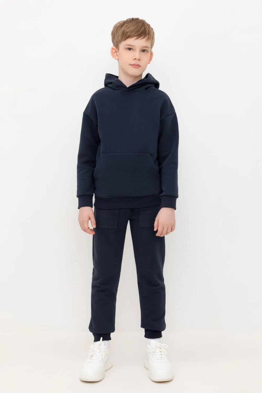 Трикотажные брюки для мальчика из петельчатого футера трехнитки. Эластичный пояс на резинке регулируется по ширине с помощью шнурка, по бокам два удобных накладных кармана, внизу эластичные манжеты.