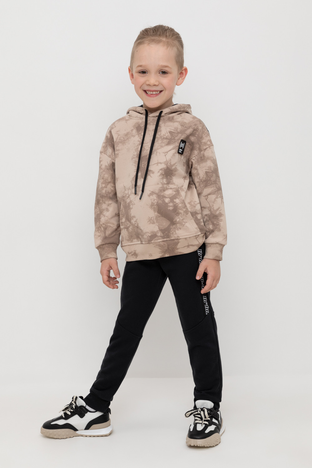 Трикотажные брюки с карманами для мальчика из петельчатого футера диагональ. Эластичный пояс на резинке регулируется по ширине с помощью шнурка, по бокам два удобных кармана, внизу эластичные манжеты.