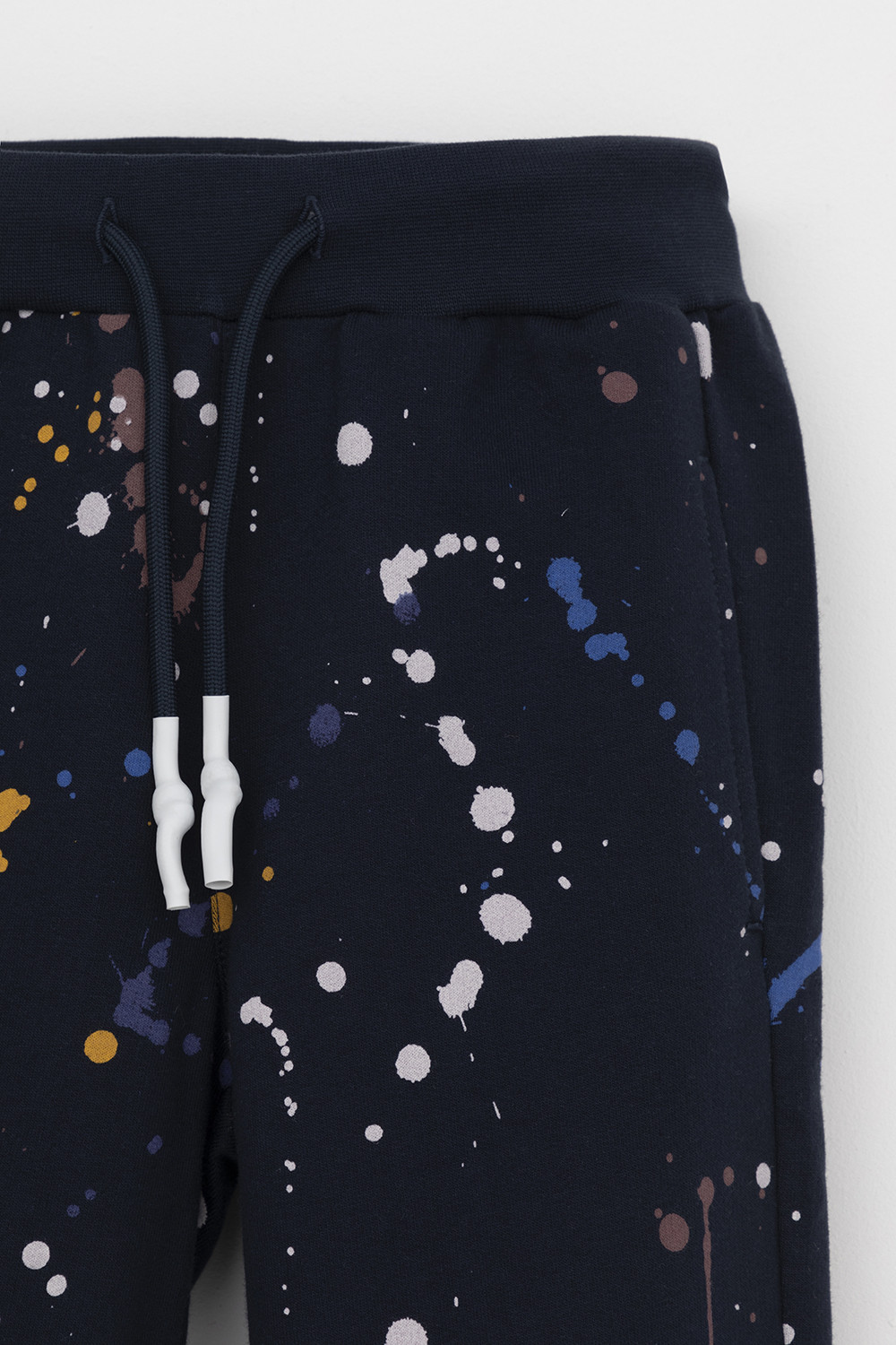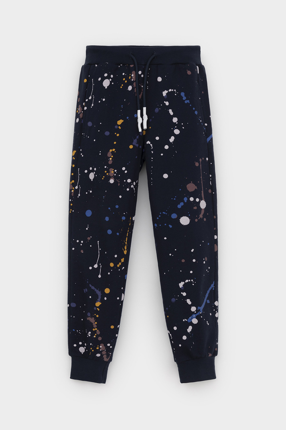 Трикотажные брюки для мальчика из петельчатого футера. Эластичный пояс на резинке регулируется по ширине с помощью шнурка, по бокам два удобных кармана, внизу эластичные манжеты.