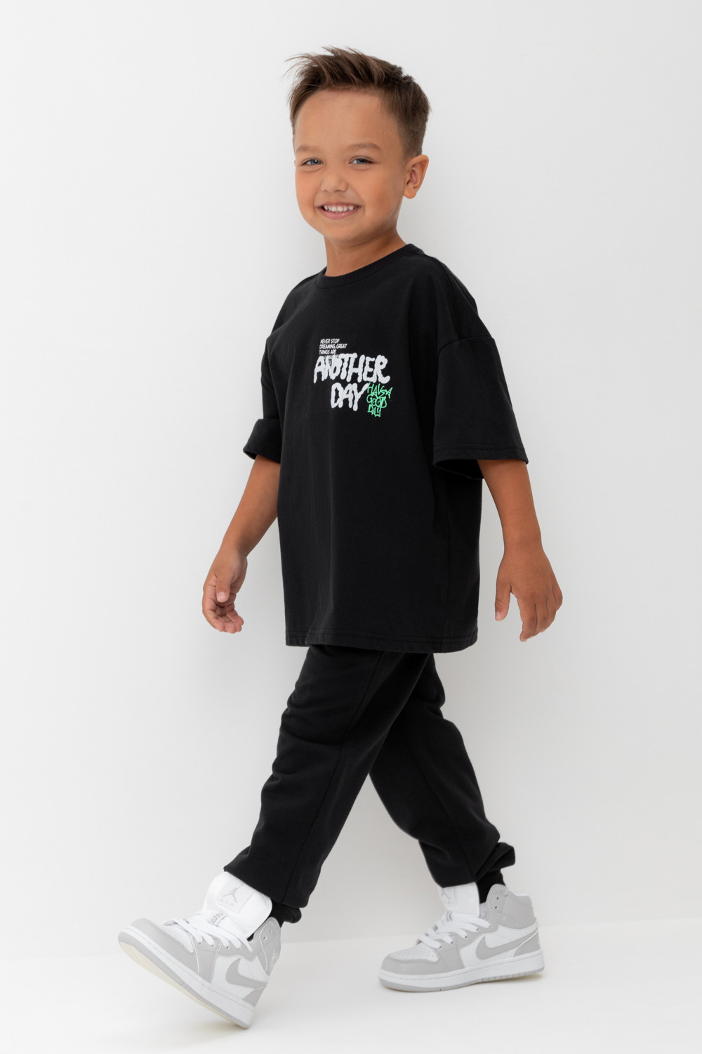 Объёмные брюки для мальчика из мягкого петельчатого трикотажа.  Эластичный пояс на резинке регулируется по ширине с помощью шнурка, по бокам два удобных кармана, внизу эластичные манжеты.