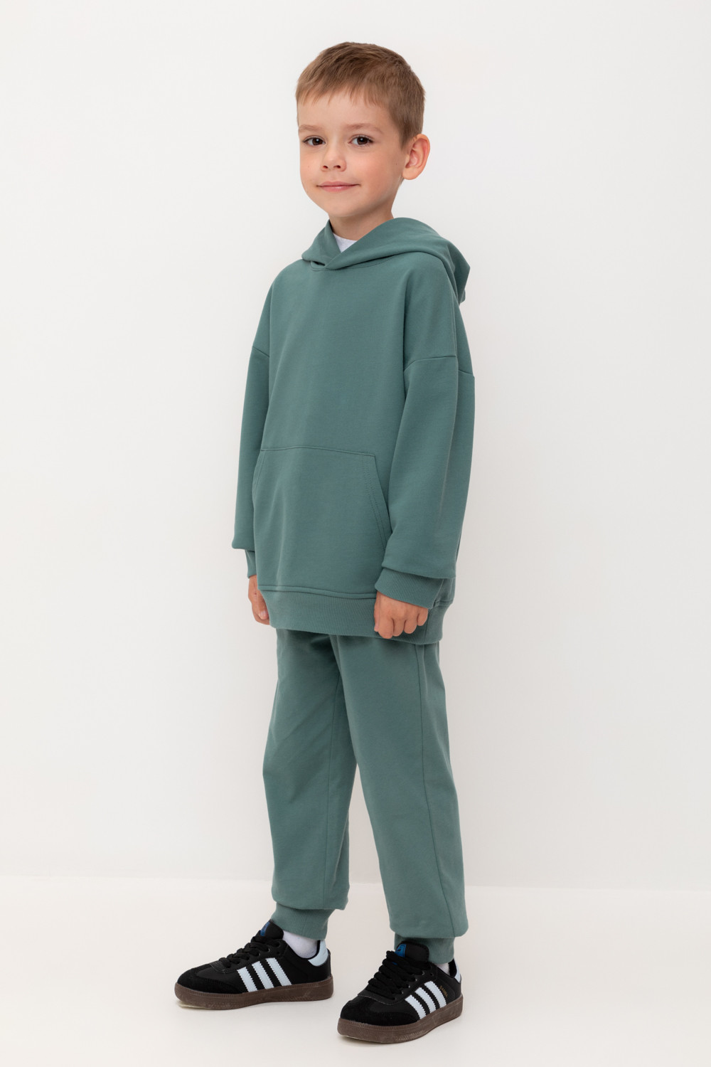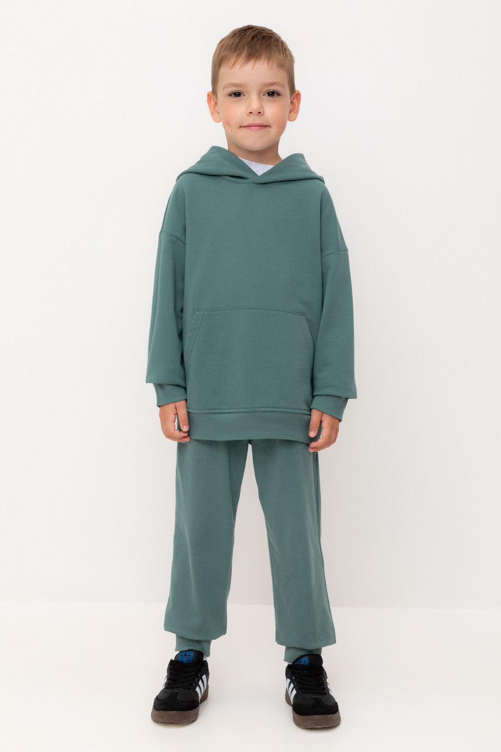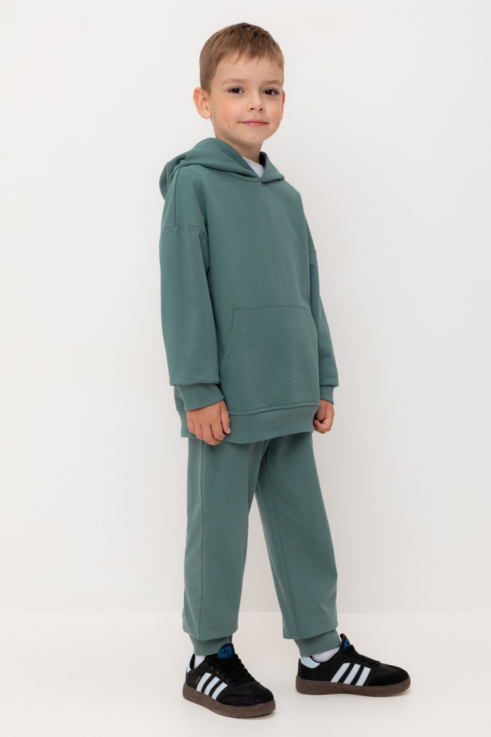 Брюки для мальчика из высококачественного трикотажного полотна. Пояс на резинке регулируется по ширине с помощью шнурка. По бокам два удобных кармана. Внизу эластичные манжеты.