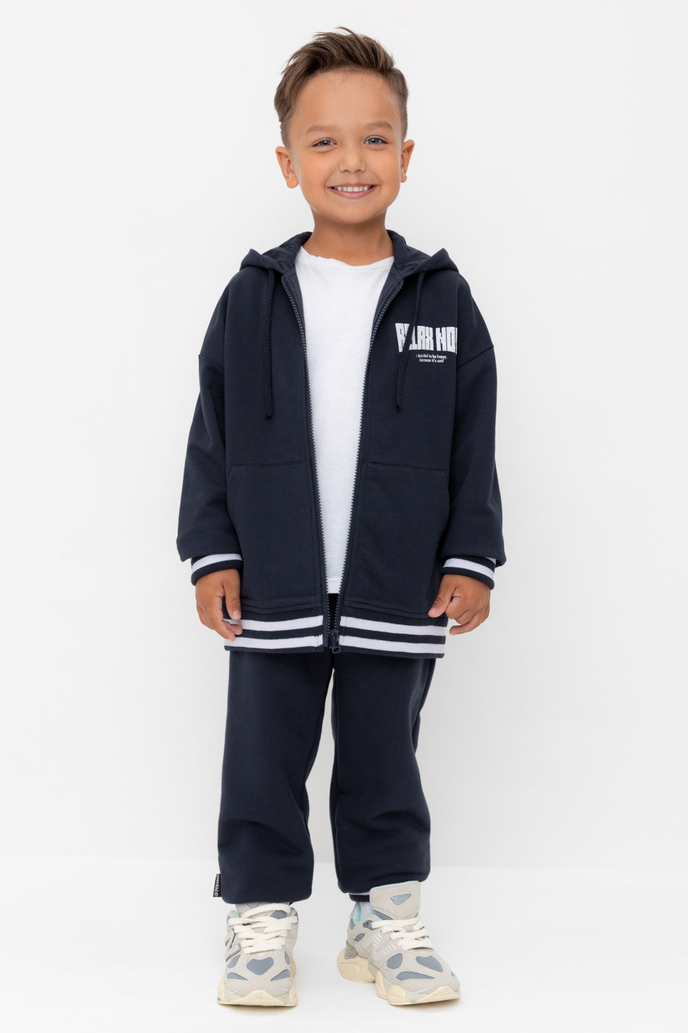 Объёмные брюки для мальчика из мягкого петельчатого трикотажа. В составе 80% натурального хлопка и 20% полиэстера, при этом полиэстер ввязан внутрь по особой технологии и не соприкасается с кожей. Эластичный пояс на резинке регулируется по ширине с помощью шнурка, по бокам два удобных кармана, внизу эластичные манжеты.