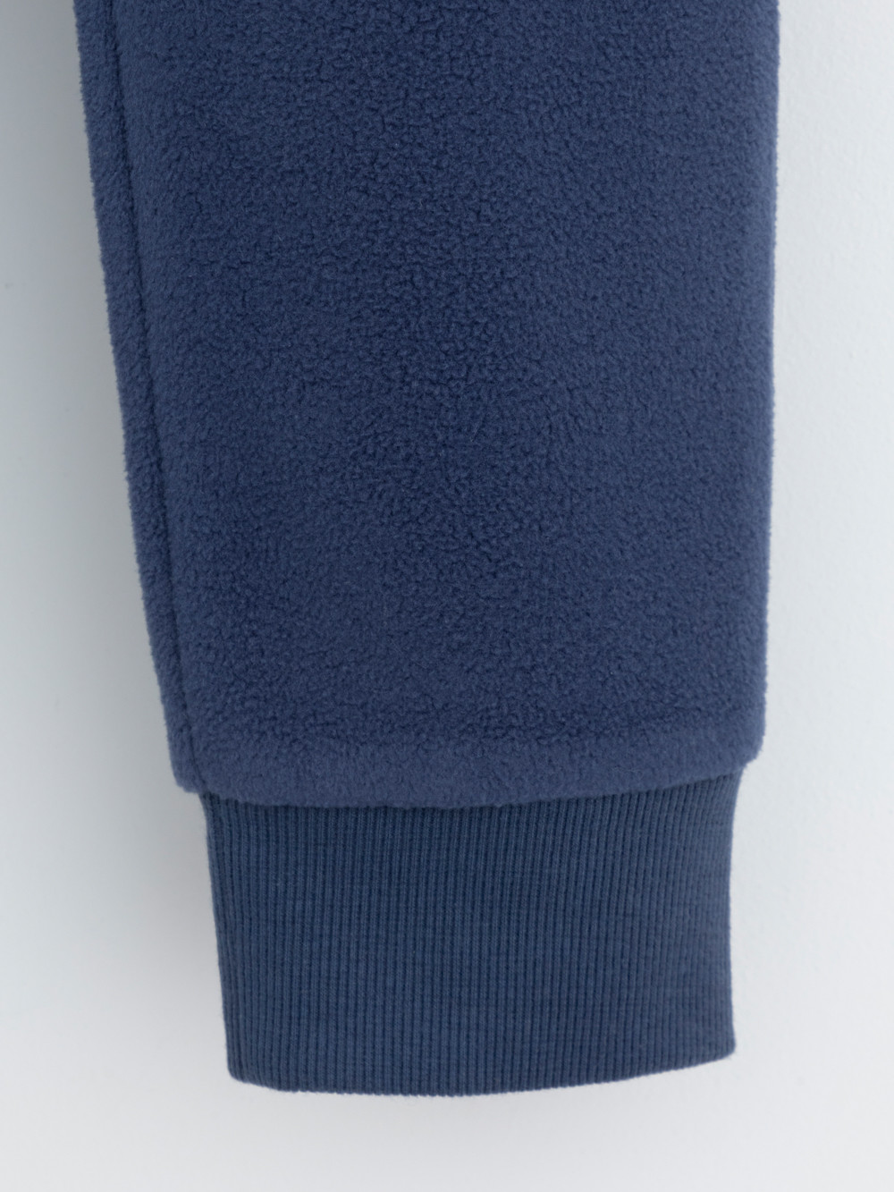 Однотонные детские брюки из флиса с поясом на резинке. Низ изделия на манжетах из эластичного трикотажа в рубчик. Брюки сохраняют цвет и форму после многократных стирок.