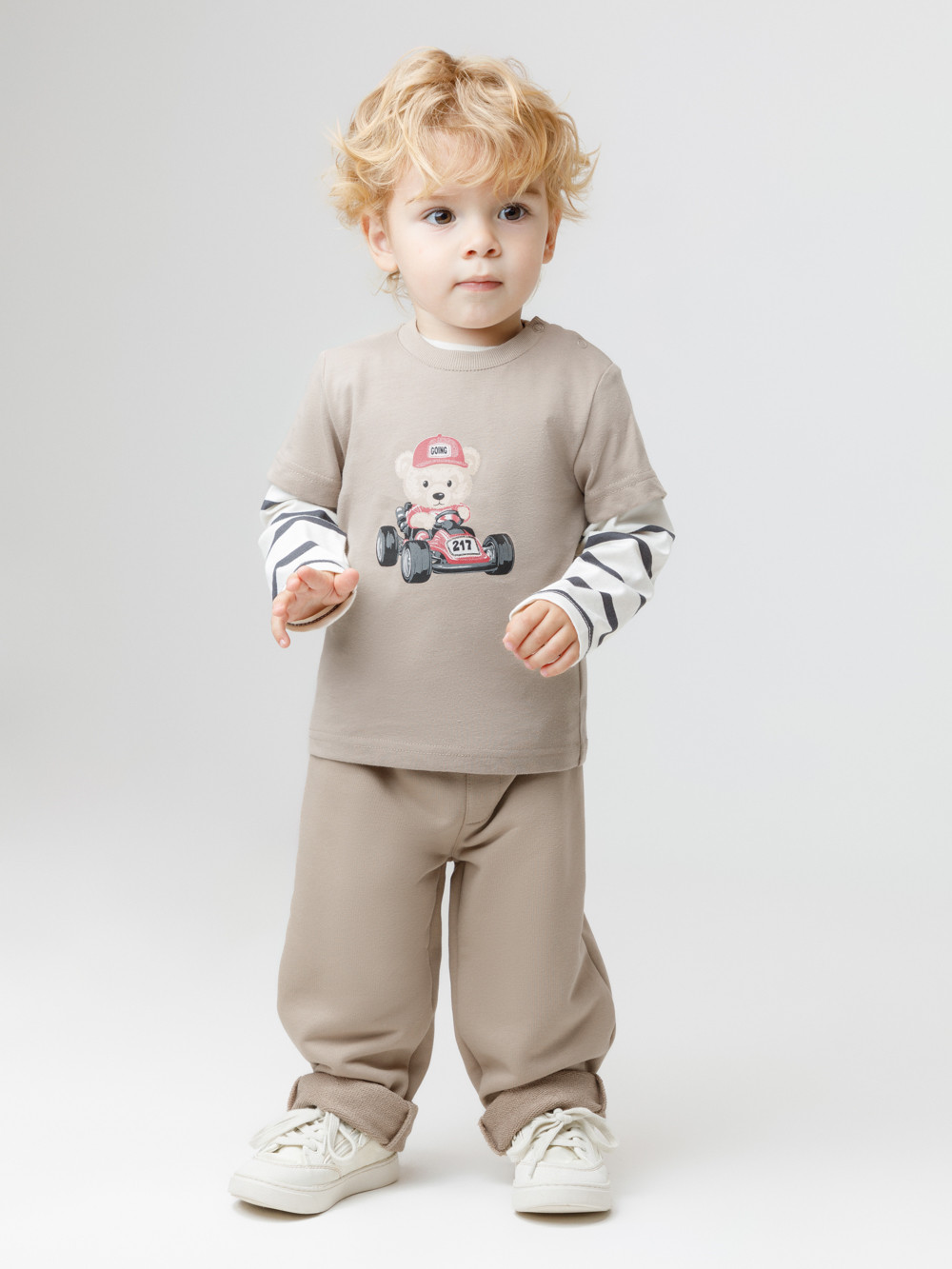 Брюки для мальчика из мягкого петельчатого футера трёхнитки. В составе 80% натурального хлопка и 20% полиэстера, при этом полиэстер ввязан внутрь по особой технологии и не соприкасается с кожей. Модель с эластичным поясом на резинке и отворотами по низу изделия. Брюки сохраняют цвет и форму после многократных стирок. Все трикотажные полотна производятся в соответствии с нормами швейцарского сертификата ЭкоТекс.