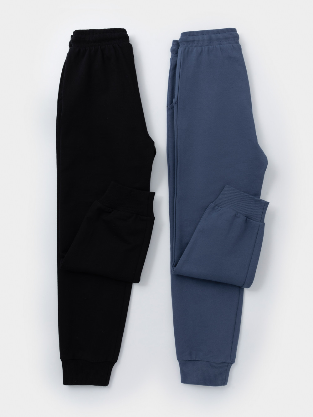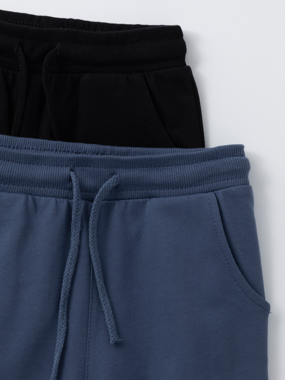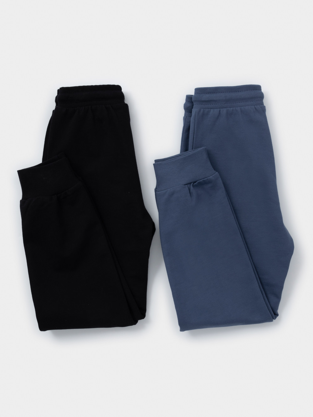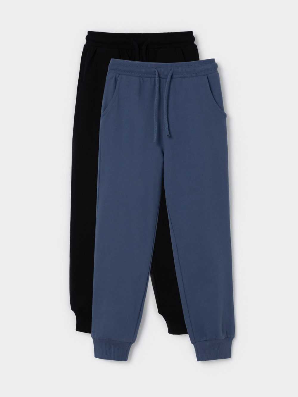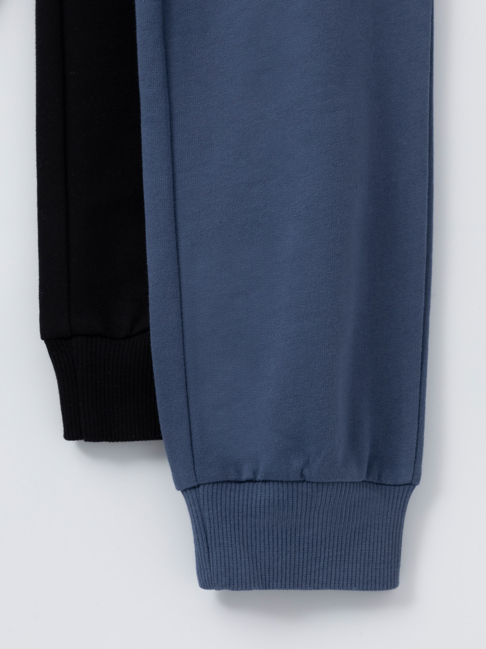 Трикотажные брюки для мальчика, комплект из 2 штук. Изготовлены из мягкого петельчатого футера, который произведён из 100% натурального хлопка высокого качества. Брюки отлично дышат, а свободный крой не стесняет движения, поэтому они комфортны для активных игр, отдыха и занятий спортом. Пояс на резинке регулируется при помощи шнурка. Низ на манжетах. Изделия сохраняют цвет и форму после многократных стирок. Все трикотажные полотна производятся в соответствии с нормами швейцарского сертификата ЭкоТекс.