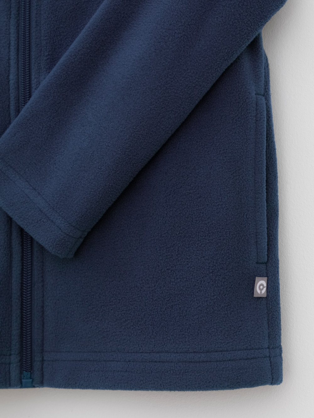 Флисовая куртка для мальчика. У изделия высокий воротник и застёжка на молнию с мягкой защитой шеи и подбородка. По бокам два кармана. Куртка сохраняет цвет и форму после многократных стирок.