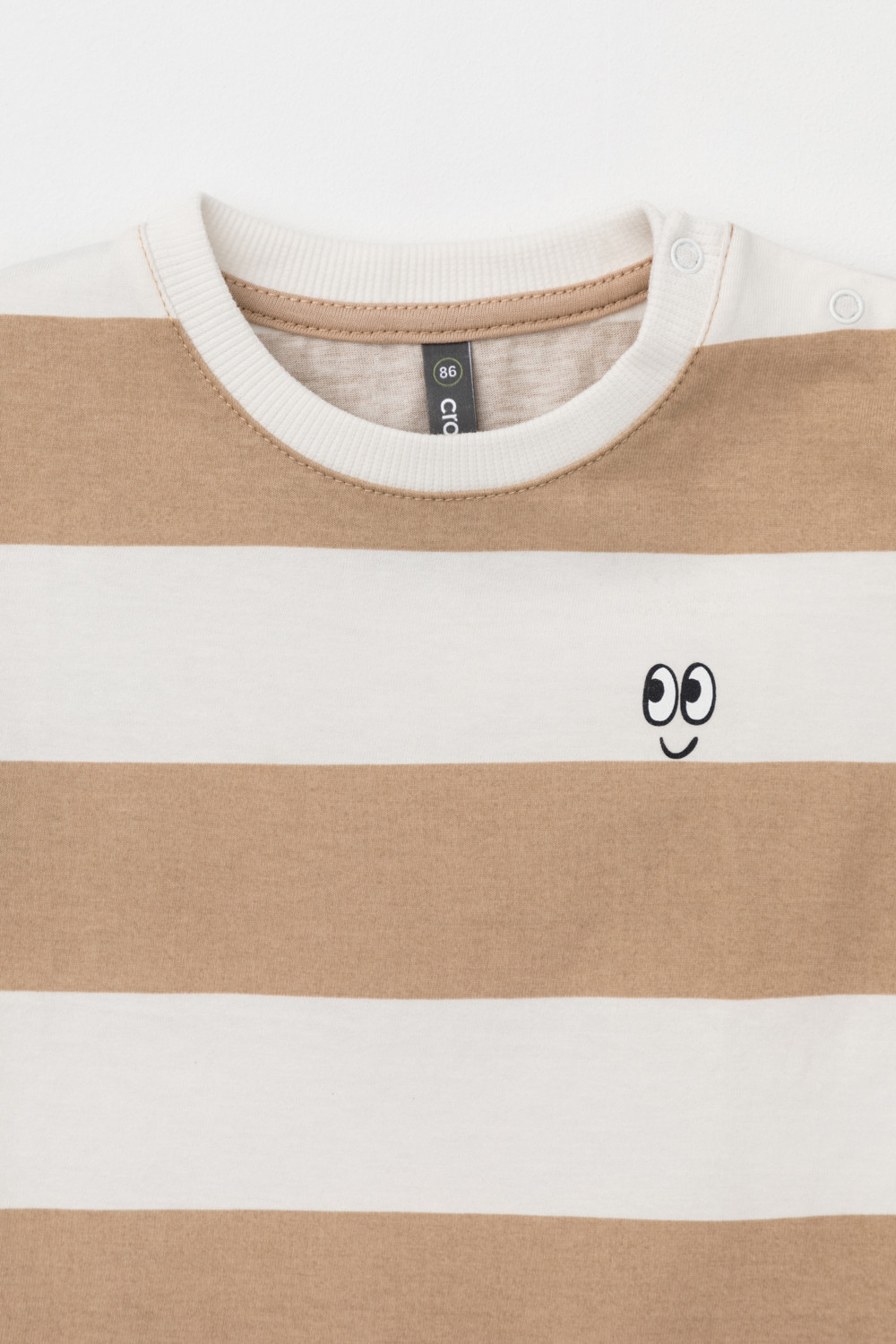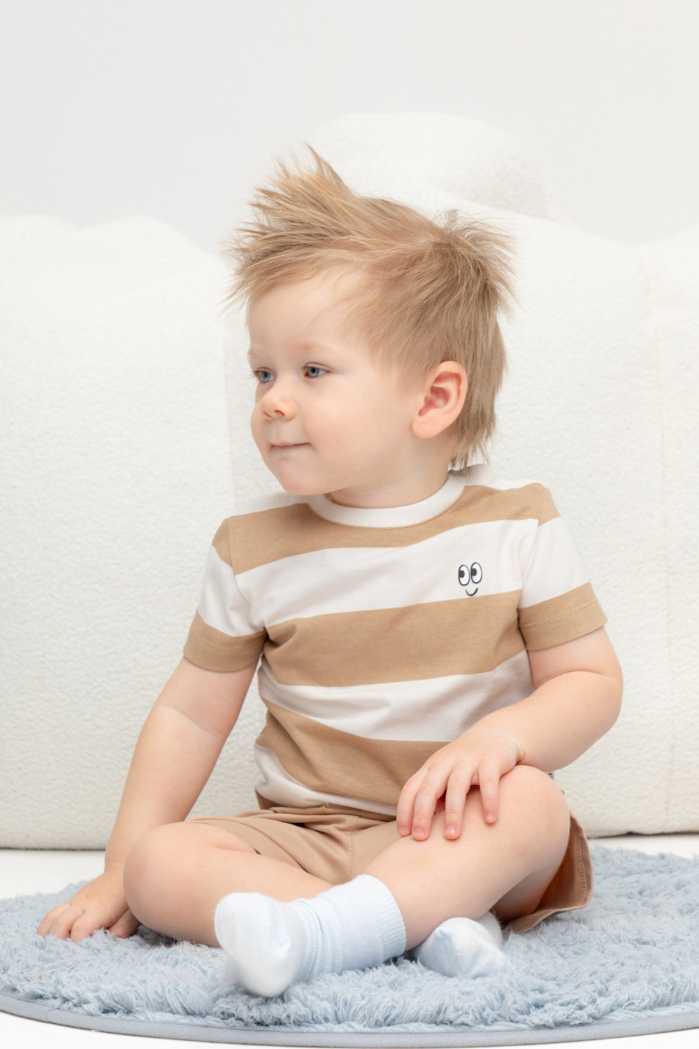 Футболка для мальчика в полоску из высококачественного трикотажного полотна.Оригинальная набивка выполнена из стойких текстильных красителей. Для удобства на плече застежка на кнопки