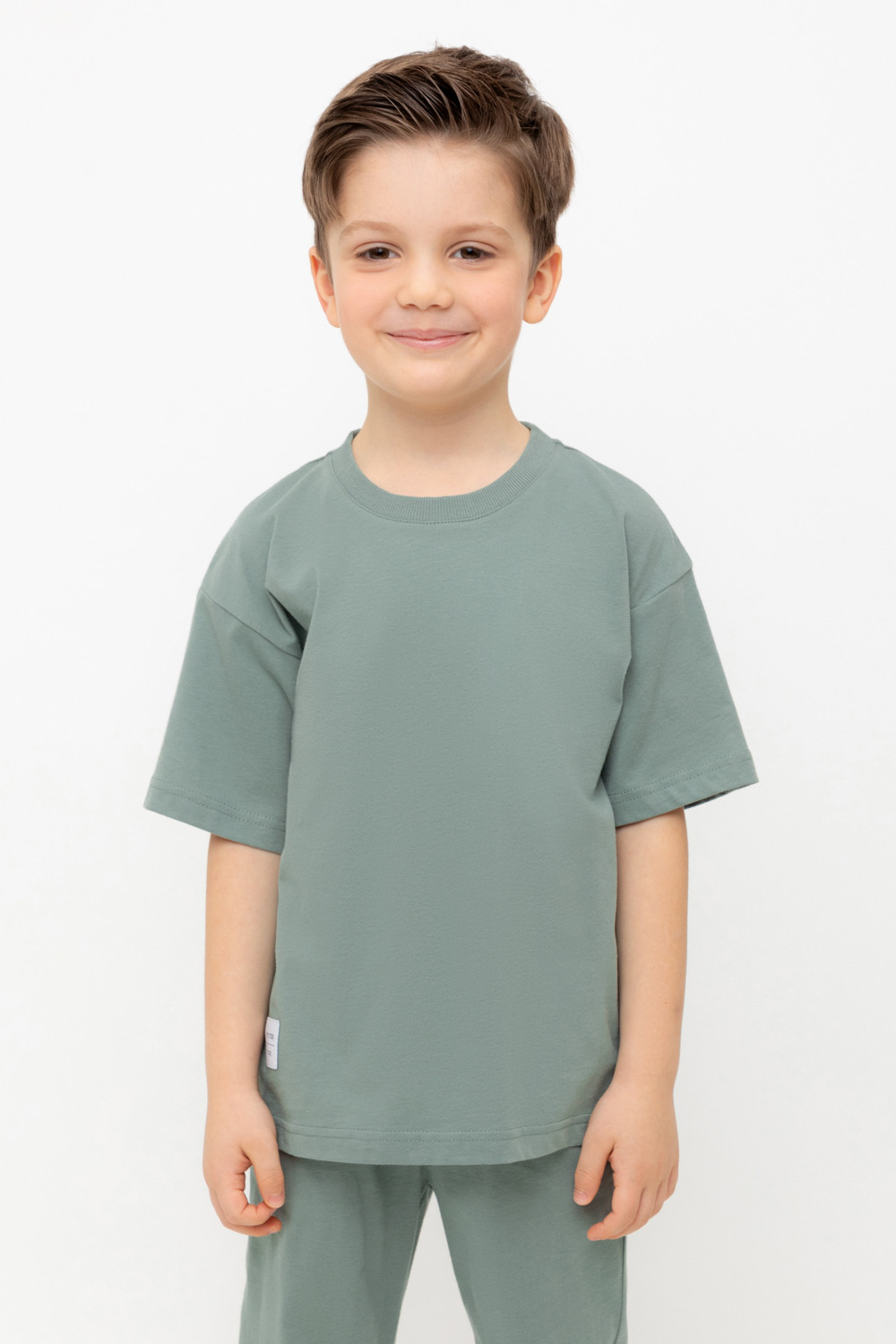Однотонная футболка для мальчика из высококачественного трикотажного полотна. Для удобства одевания в размерах 92 и 98 застёгивается на спинке с помощью кнопок.
