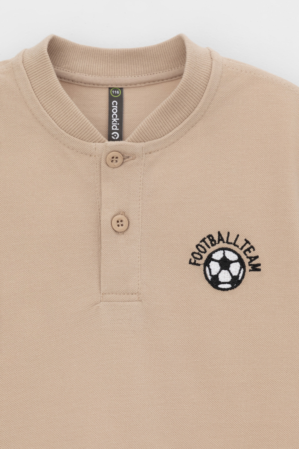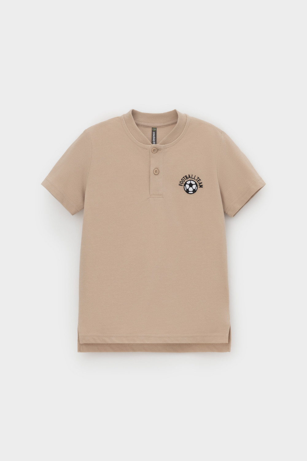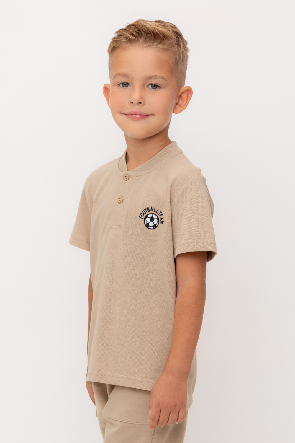 Поло с вышивкой для мальчика. Изготовлено из высококачественного трикотажного полотна пике. У изделия вязаный воротник и застежка спереди на две пуговицы.