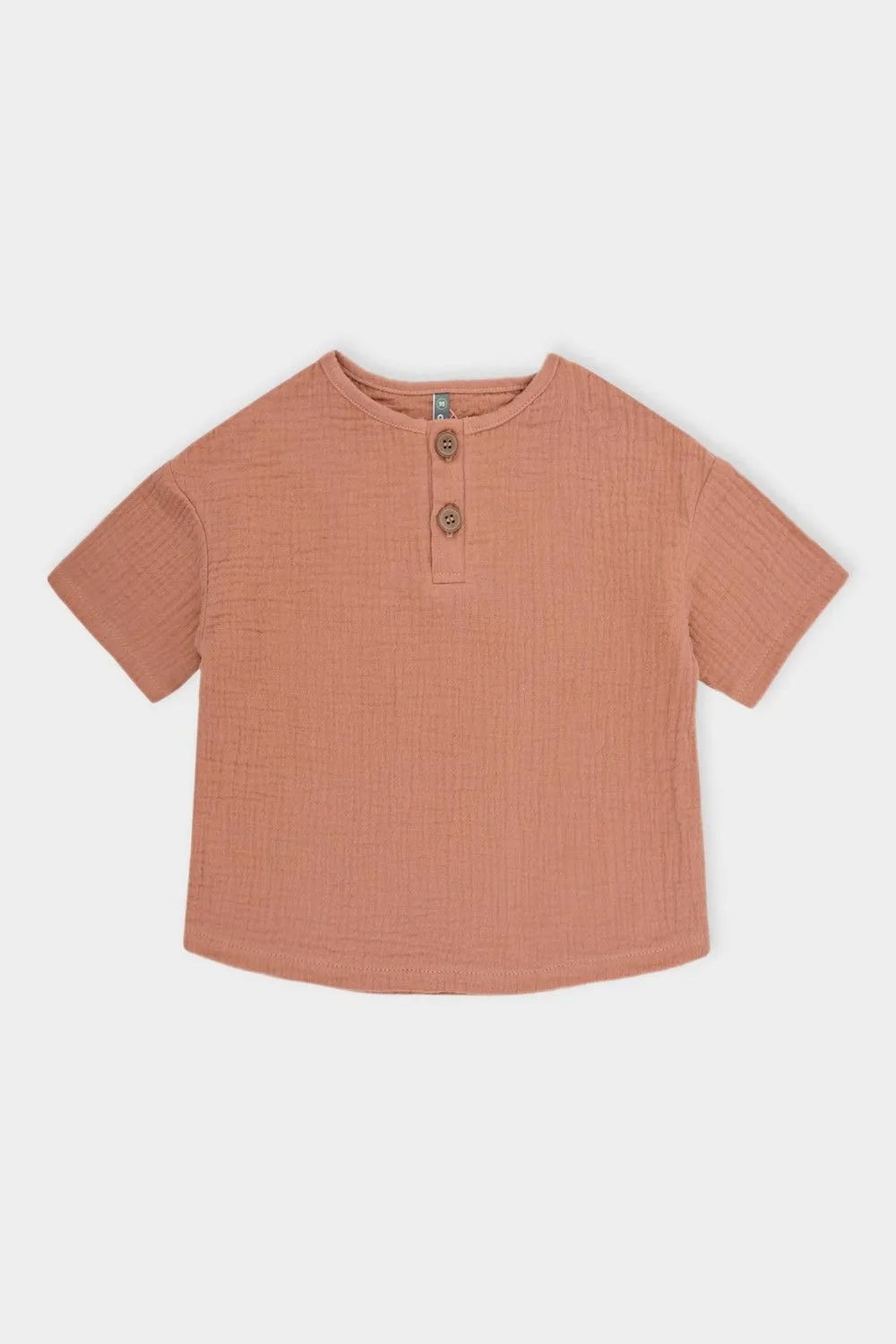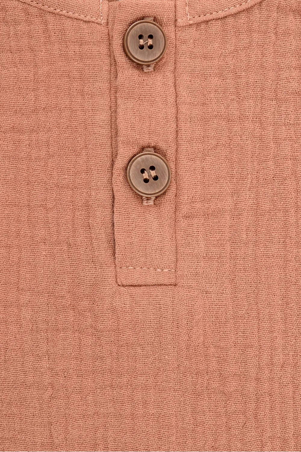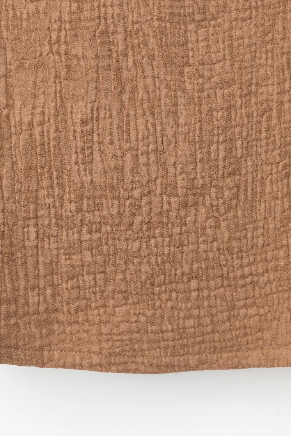 Легкая детская рубашка свободного кроя из мягкого хлопокового муслина, слегка спущенной линией плеча, длинными рукавами и с застежкой на пуговицы. Изделие сохраняет цвет, форму и фактуру жатости после многократных стирок.