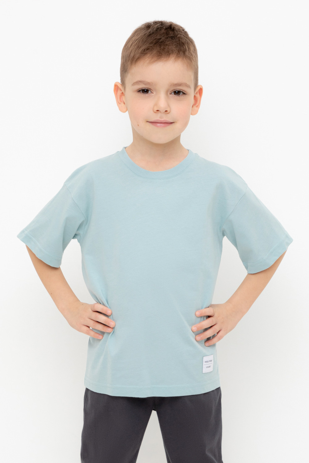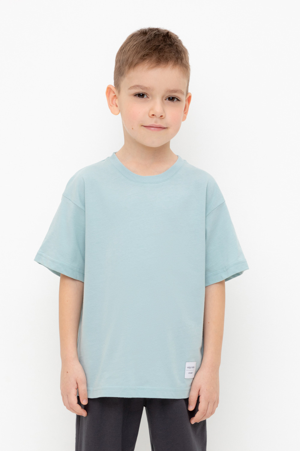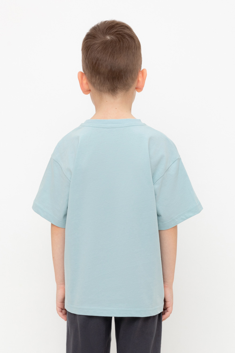 Однотонная футболка для мальчика из высококачественного трикотажного полотна. Для удобства одевания в размерах 92 и 98 застёгивается на спинке с помощью кнопок.