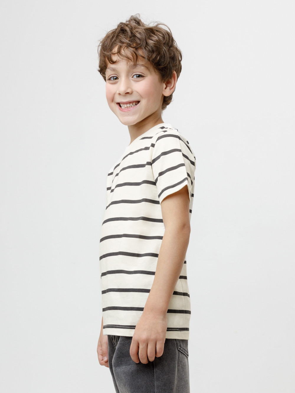 Футболка для мальчика из гладкого трикотажа, произведённого из высококачественного натурального хлопка. Для удобства одевания имеется застёжка на кнопки в размерах 92 и 98. Изделие сохраняет цвет и форму после многократных стирок. Все трикотажные полотна производятся в соответствии с нормами швейцарского сертификата ЭкоТекс.