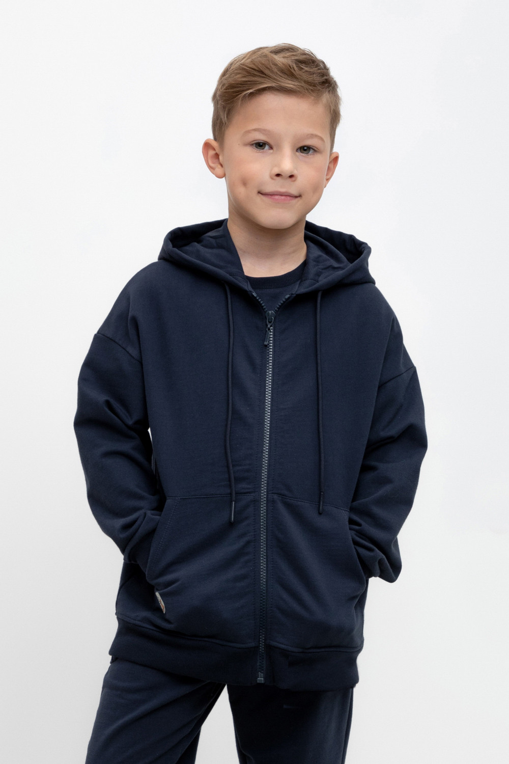 Трикотажная толстовка для мальчика из петельчатого футера. Спереди удобные карманы. Манжеты и пояс из эластичного трикотажа в рубчик.