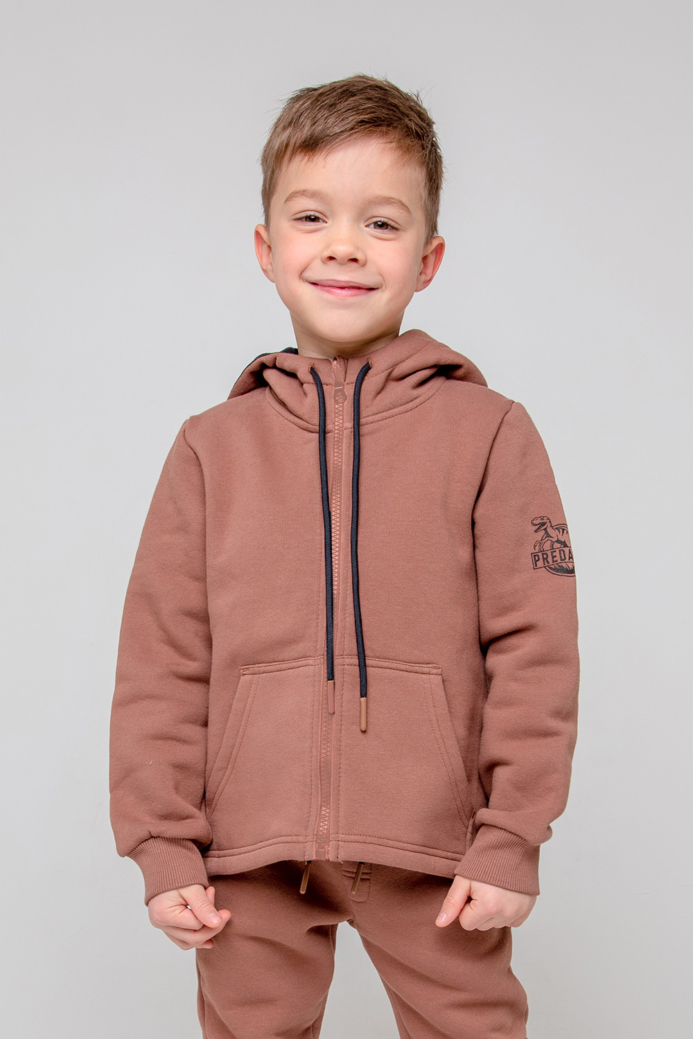 Куртка для мальчика из футера трехнитки с начесом. Капюшон с подкладом из гладкого трикотажа регулируется с помощью шнурка. Предусмотрена защита шеи и подбородка. У изделия эластичные манжеты и накладные карманы. Изделие сохраняет цвет и форму после многократных стирок.