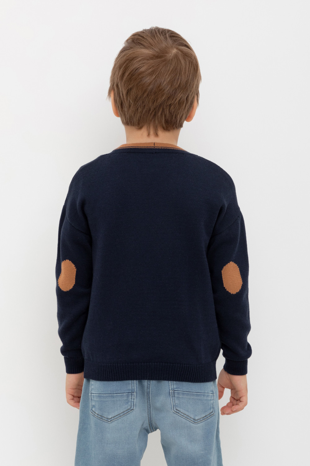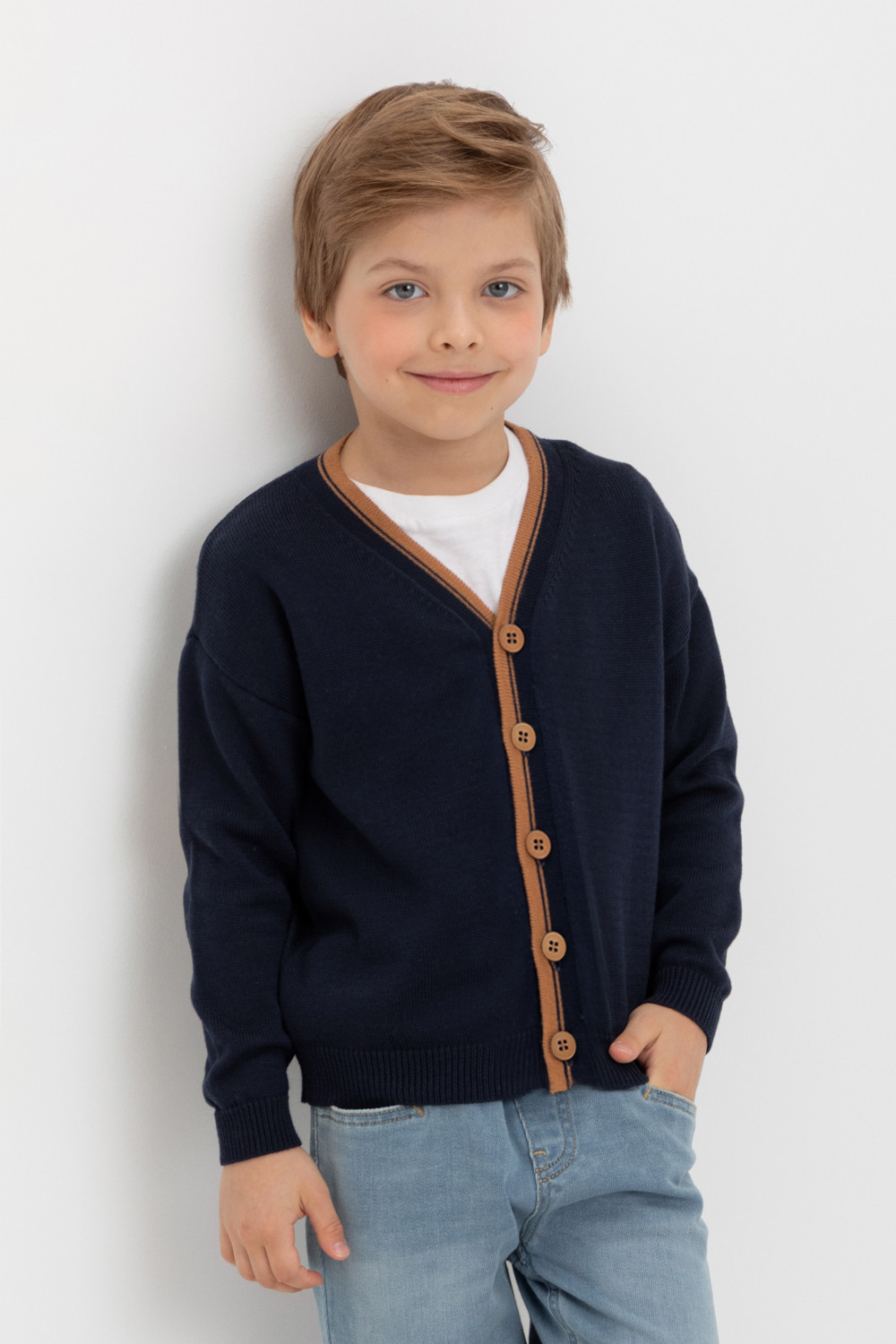 Вязаный кардиган для мальчика с втачными рукавами. Связан из хлопковой пряжи. На рукавах декоративные вывязанные заплатки и эластичные манжеты. Внизу мягкий пояс. Застёгивается на пуговицы.