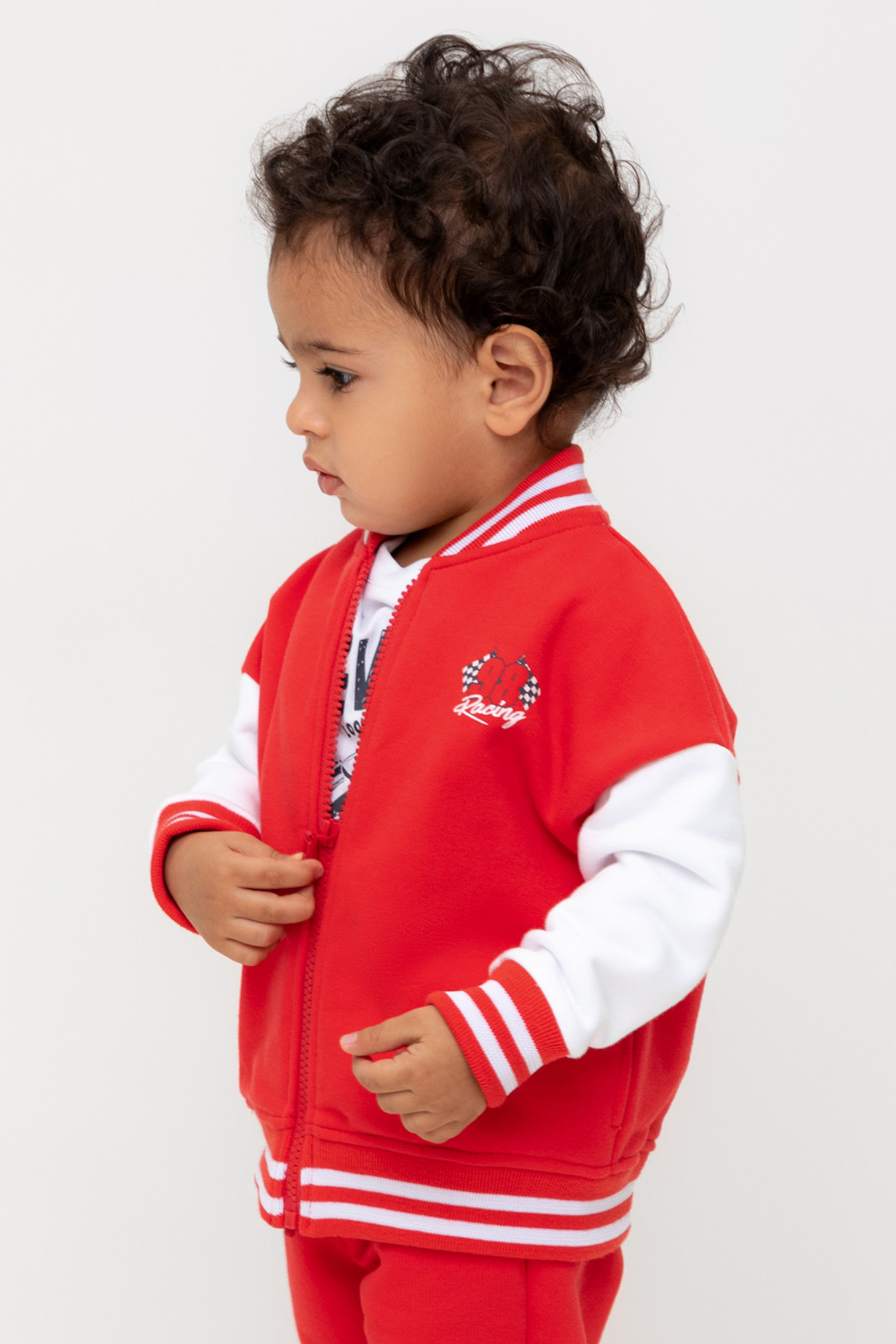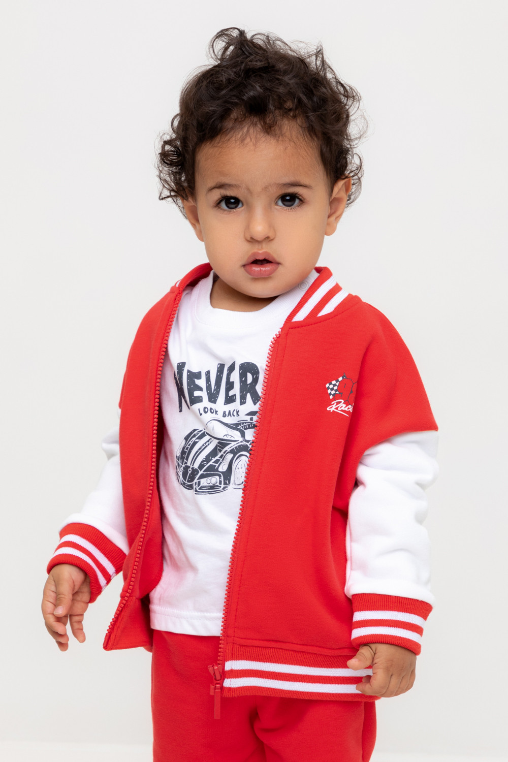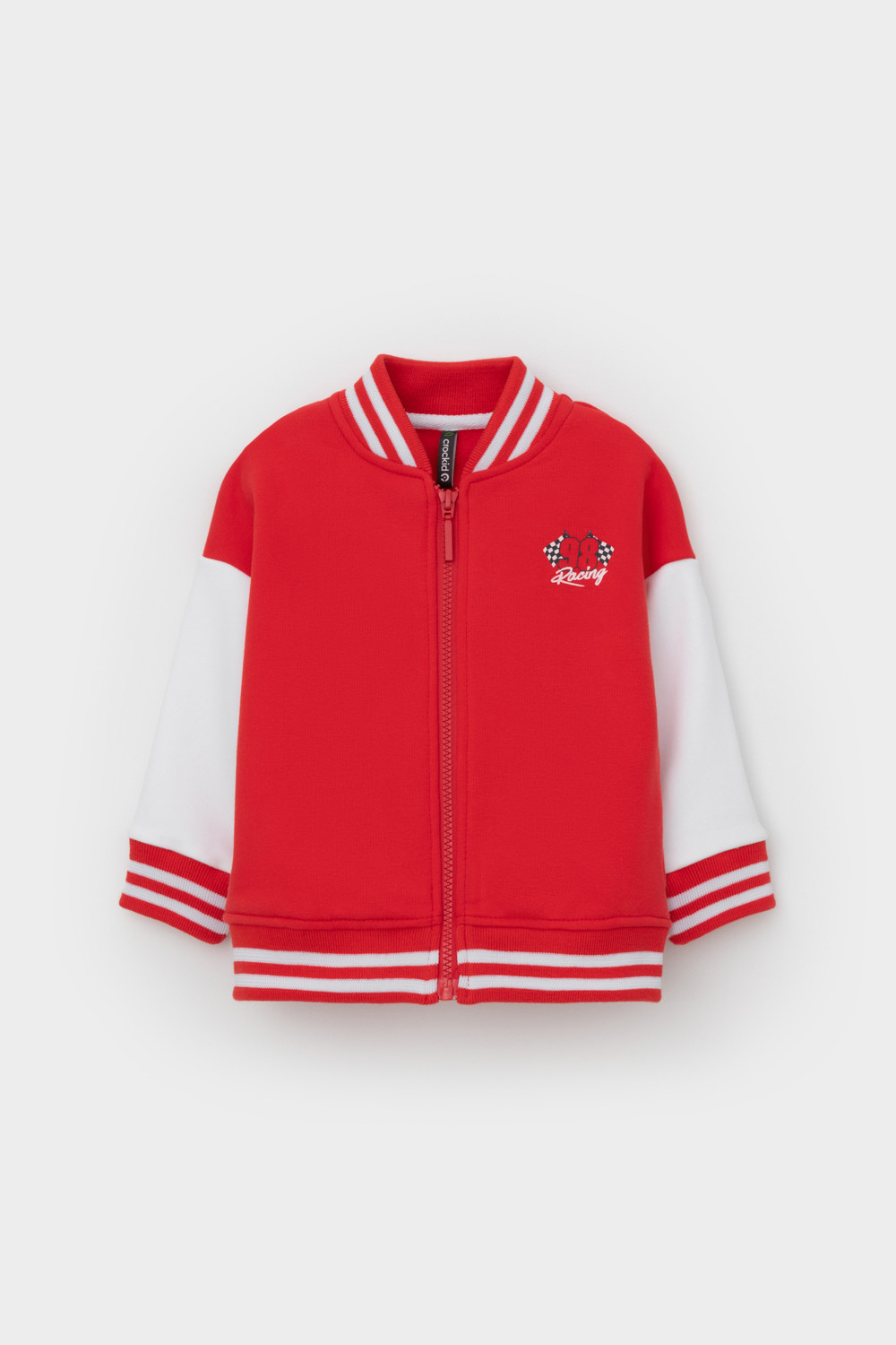 Бомбер для мальчика с контрастными рукавами из мягкого трикотажа. В составе 80% натурального хлопка и 20% полиэстера, при этом полиэстер ввязан внутрь по особой технологии и не соприкасается с кожей. Воротник, манжеты и пояс - вязаные. Застёгивается на молнию. По бокам два удобных кармана.