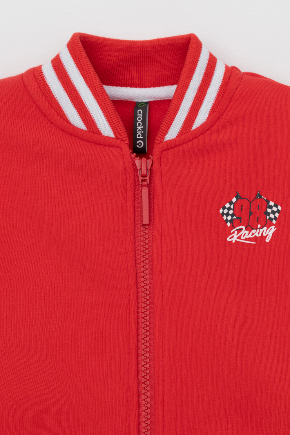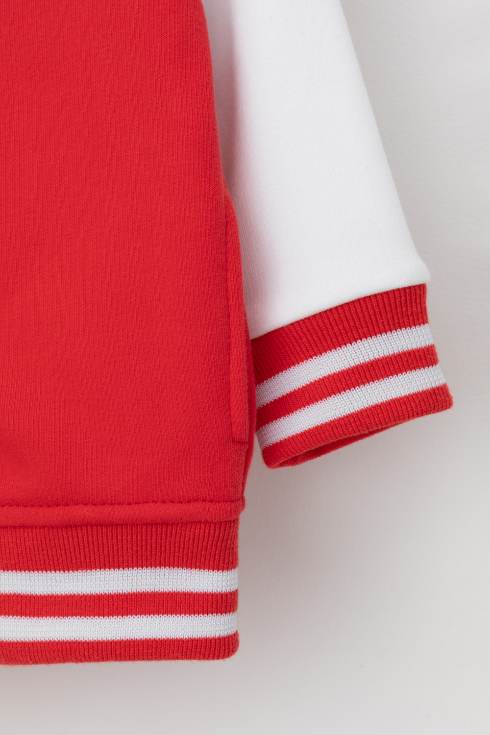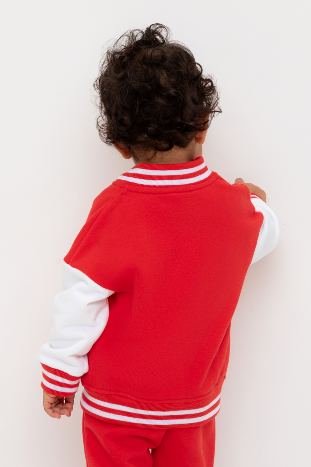 Бомбер для мальчика с контрастными рукавами из мягкого трикотажа. В составе 80% натурального хлопка и 20% полиэстера, при этом полиэстер ввязан внутрь по особой технологии и не соприкасается с кожей. Воротник, манжеты и пояс - вязаные. Застёгивается на молнию. По бокам два удобных кармана.