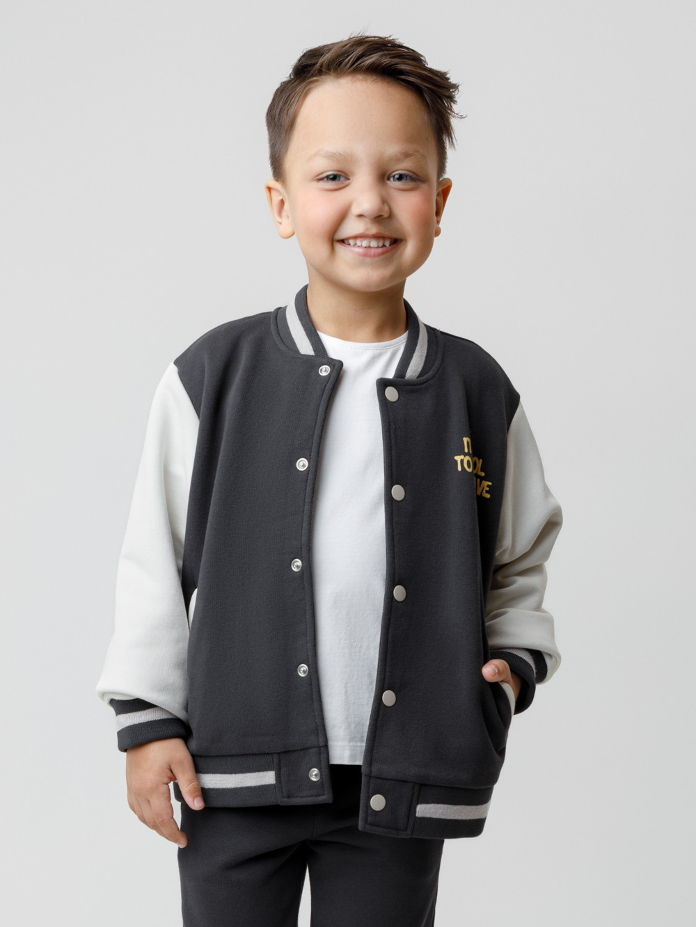 Бомбер для мальчика с контрастными рукавами из мягкого трикотажа. Застёгивается на кнопки. Воротник, манжеты и пояс вязаные. Спереди два кармана. Изделие сохраняет цвет и форму после многократных стирок. Все трикотажные полотна производятся в соответствии с нормами швейцарского сертификата ЭкоТекс.