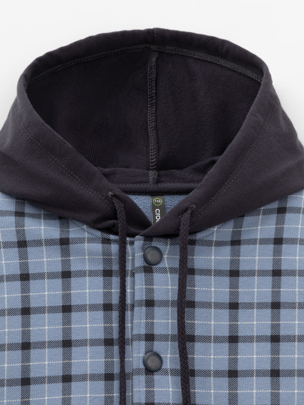 Свободная трикотажная рубашка для мальчика из мягкого петельчатого футера. В составе 80% натурального хлопка и 20% полиэстера, при этом полиэстер ввязан внутрь по особой технологии и не соприкасается с кожей. Застёгивается на кнопки. Модель с капюшоном и спущенным плечом. Рисунок в клетку выполнен из стойких текстильных гипоаллергенных красителей. Изделие сохраняет цвет и форму после многократных стирок. Все трикотажные полотна производятся в соответствии с нормами швейцарского сертификата ЭкоТекс.