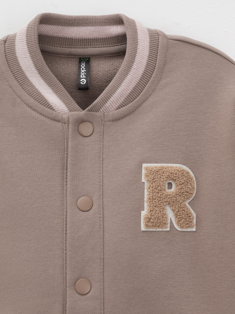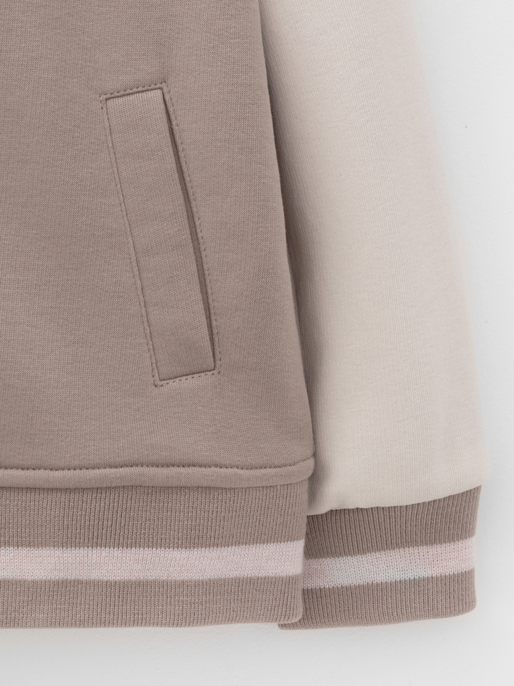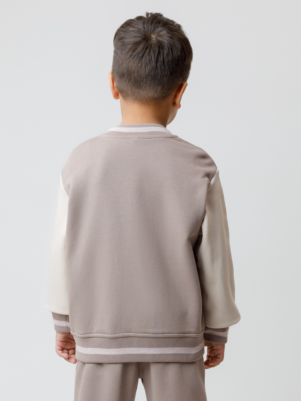 Бомбер для мальчика с контрастными рукавами из мягкого трикотажа. Воротник, манжеты и пояс вязаные. Спереди два кармана. Изделие сохраняет цвет и форму после многократных стирок. Все трикотажные полотна производятся в соответствии с нормами швейцарского сертификата ЭкоТекс.