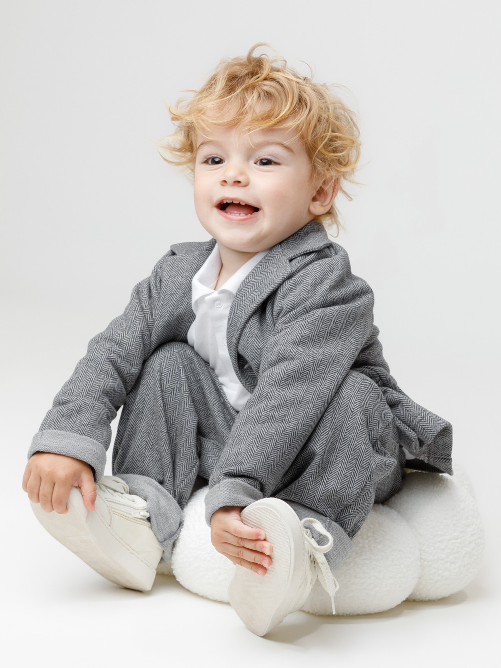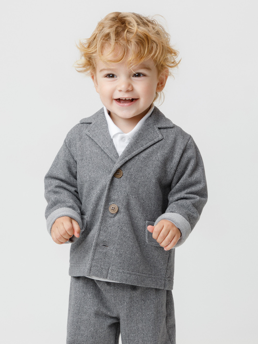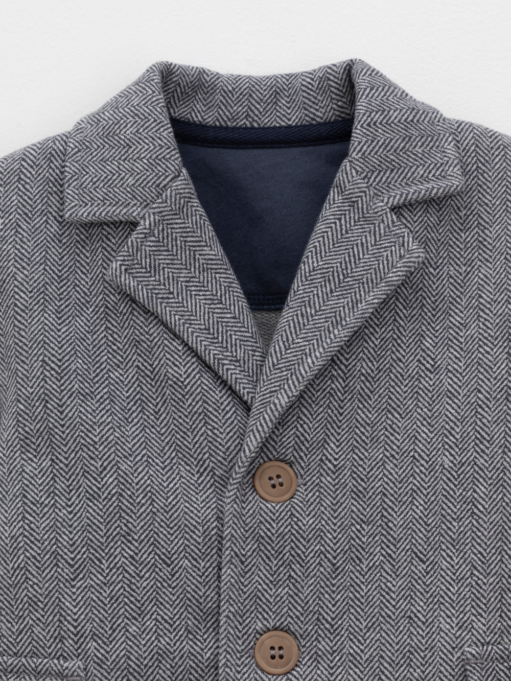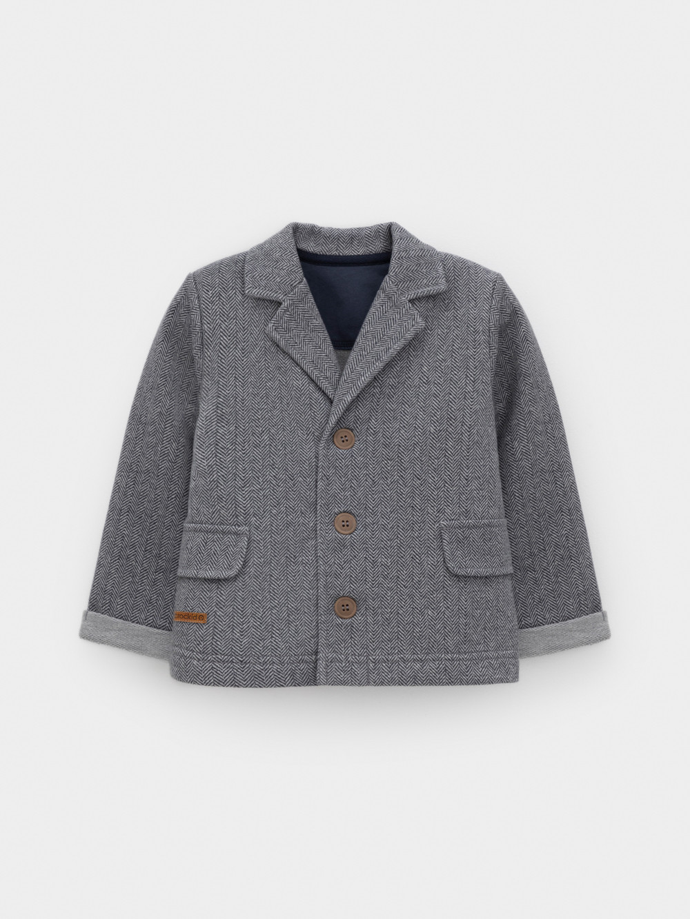 Жакет на пуговицах для мальчика. Изготовлен из высококачественного футера петли. У изделия длинные рукава с отворотами и имитированные карманы с клапанами. Внутри петелька из жаккарда. Все трикотажные полотна производятся в соответствии с нормами швейцарского сертификата ЭкоТекс.