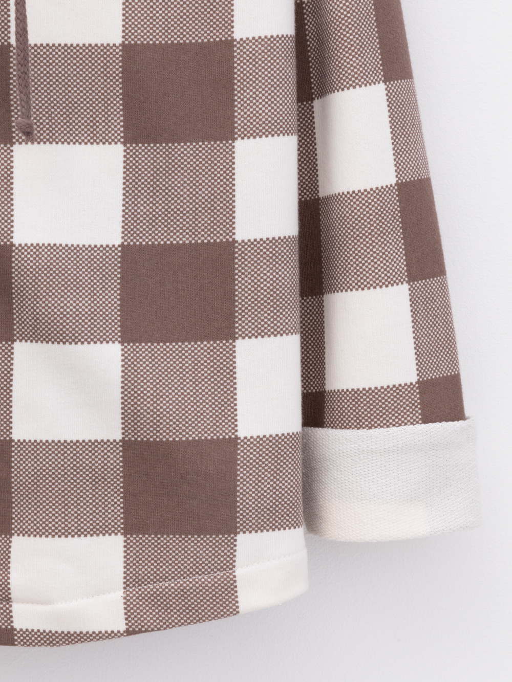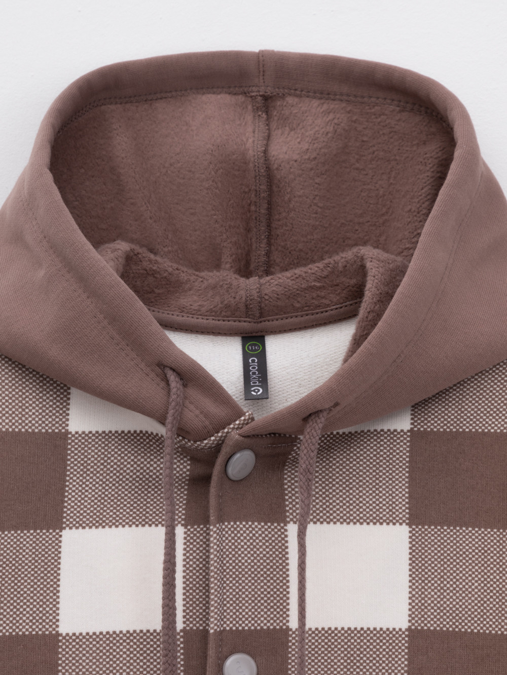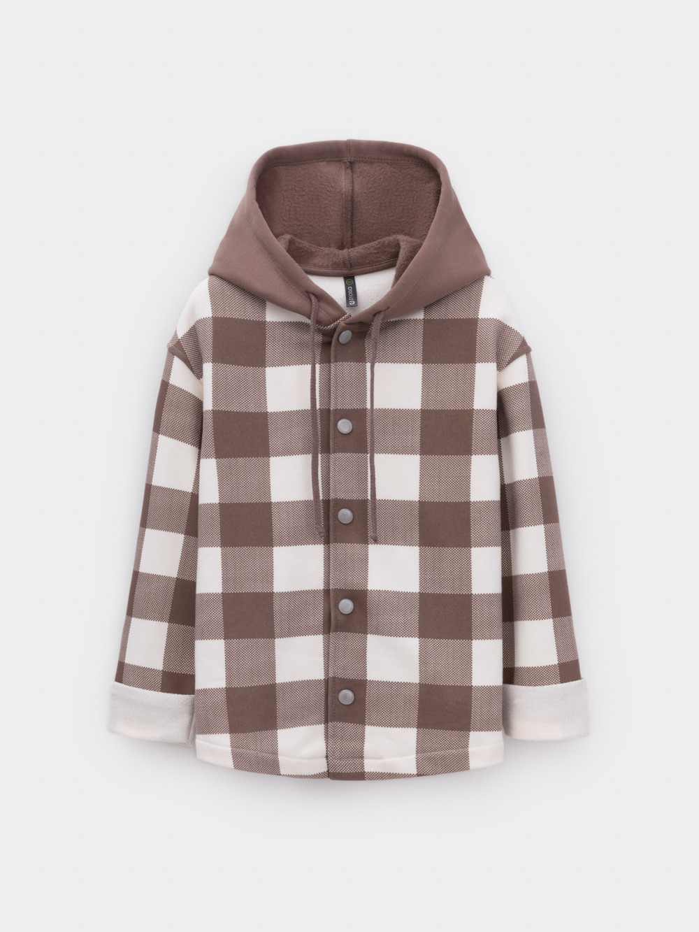 Свободная трикотажная рубашка для мальчика из мягкого петельчатого футера. В составе 80% натурального хлопка и 20% полиэстера, при этом полиэстер ввязан внутрь по особой технологии и не соприкасается с кожей. Застёгивается на кнопки. Модель с капюшоном и спущенным плечом. Рисунок в клетку выполнен из стойких текстильных гипоаллергенных красителей. Изделие сохраняет цвет и форму после многократных стирок. Все трикотажные полотна производятся в соответствии с нормами швейцарского сертификата ЭкоТекс.