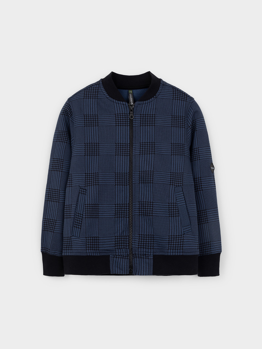 Бомбер для мальчика из мягкого трикотажа. Застёгивается на молнию. Воротник, манжеты и пояс -из эластичного трикотажа в рубчик. Спереди карманы с листочкой.