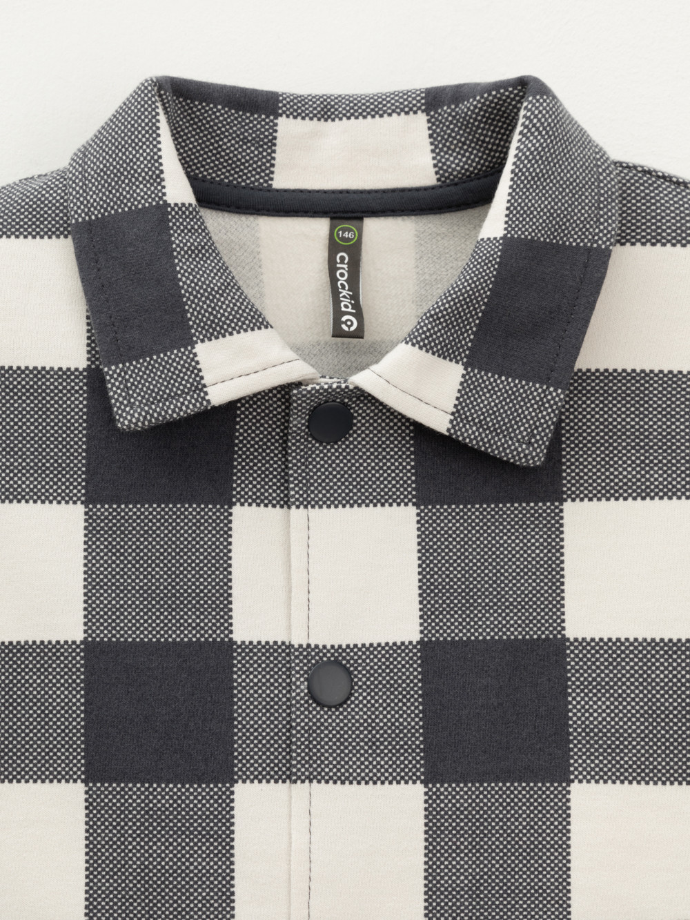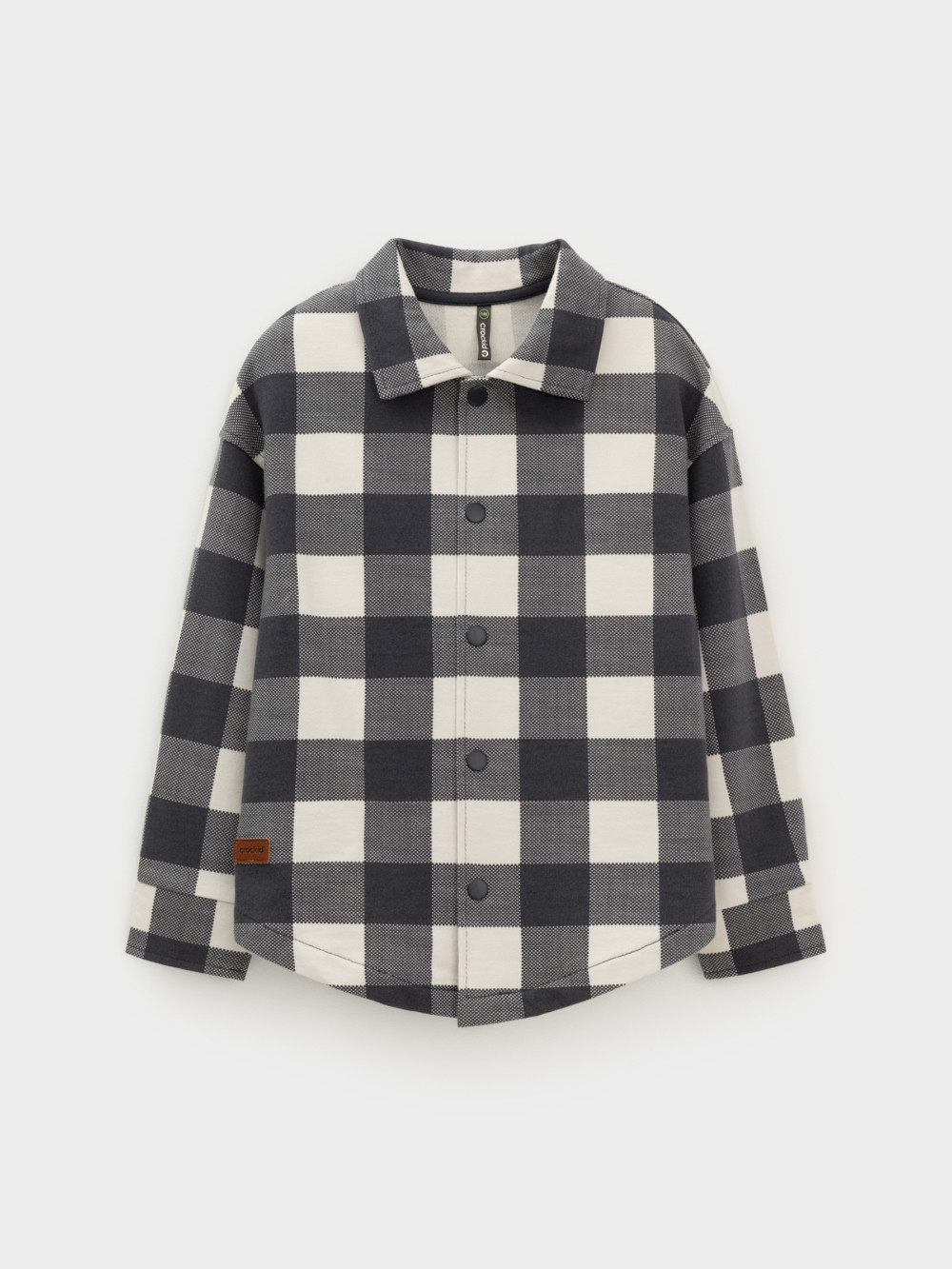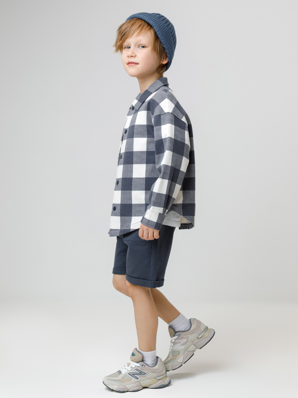 Свободная трикотажная рубашка для мальчика из мягкого петельчатого футера. Застёгивается на кнопки. Модель с закругленным низом и спущенным плечом. Рисунок в клетку выполнен из стойких текстильных гипоаллергенных красителей. Изделие сохраняет цвет и форму после многократных стирок. Все трикотажные полотна производятся в соответствии с нормами швейцарского сертификата ЭкоТекс.
