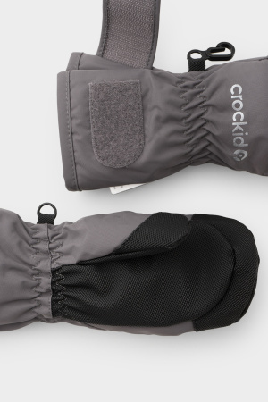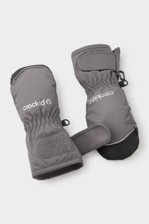 Детские утеплённые рукавицы из однотонной мембранной ткани со вставками из искусственной кожи. Удлинённые манжеты на молнии. Мягкий подклад из флиса. Пластиковый карабин для скрепления рукавиц между собой. Светоотражающие элементы.