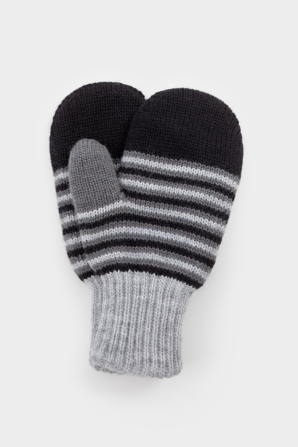 Варежки в полоску из полушерстяной пряжи. Эластичные манжеты фиксируют перчатку на руке.