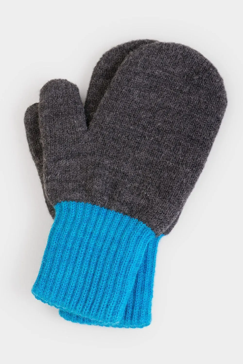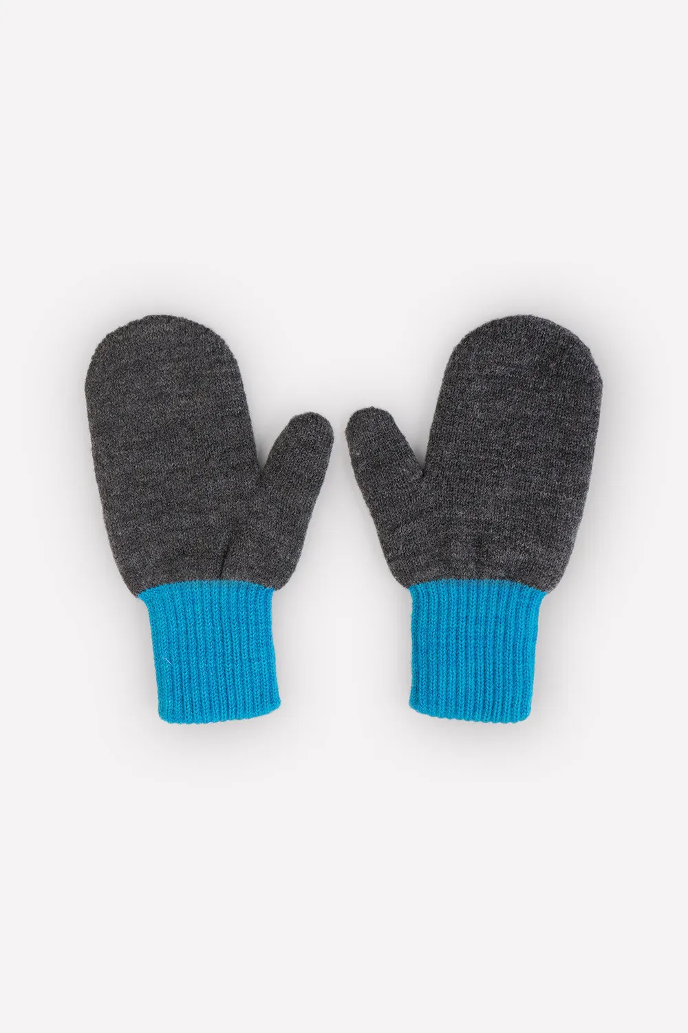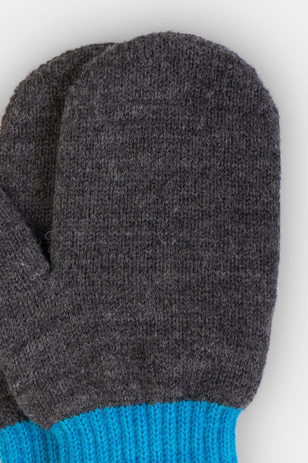 Двойные варежки из полушерстяной пряжи серого цвета. Украшены яркими бирюзовыми манжетами, которые крепко фиксируют рукавицы на запястье.
