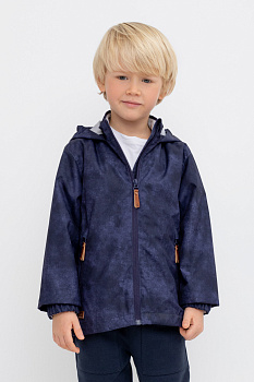 Ветровка для мальчика из мембранной ткани с дополнительной тефлоновой обработкой.  Верхняя мембранная ткань 1000/1000 с тефлоновым покрытием отталкивает воду и грязь и обладает «дышащими» свойствами. Подкладка выполнена из 100% полиэстера. У изделия предусмотрена защита подбородка. Несъемный капюшон регулируется с помощью эластичного шнура со стопперами. Низ рукавов имеет эластичную резинку для лучшего прилегания. Во всех изделиях верхнего ассортимента для безопасности ребенка предусмотрены светоотражающие элементы