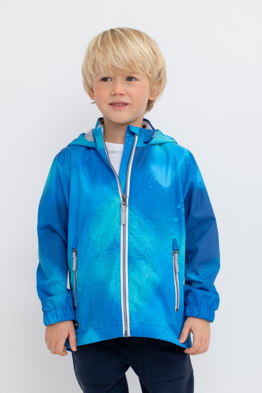 Ветровка для мальчика из мембранной ткани с дополнительной тефлоновой обработкой.  Верхняя мембранная ткань 1000/1000 с тефлоновым покрытием отталкивает воду и грязь и обладает «дышащими» свойствами. Подкладка выполнена из 100% полиэстера. У изделия предусмотрена защита подбородка. Несъемный капюшон регулируется с помощью эластичного шнура со стопперами. Низ рукавов имеет эластичную резинку для лучшего прилегания. Во всех изделиях верхнего ассортимента для безопасности ребенка предусмотрены светоотражающие элементы