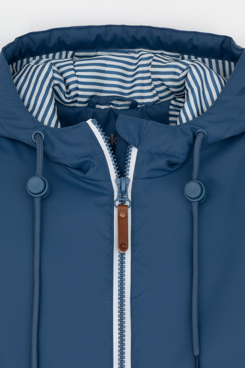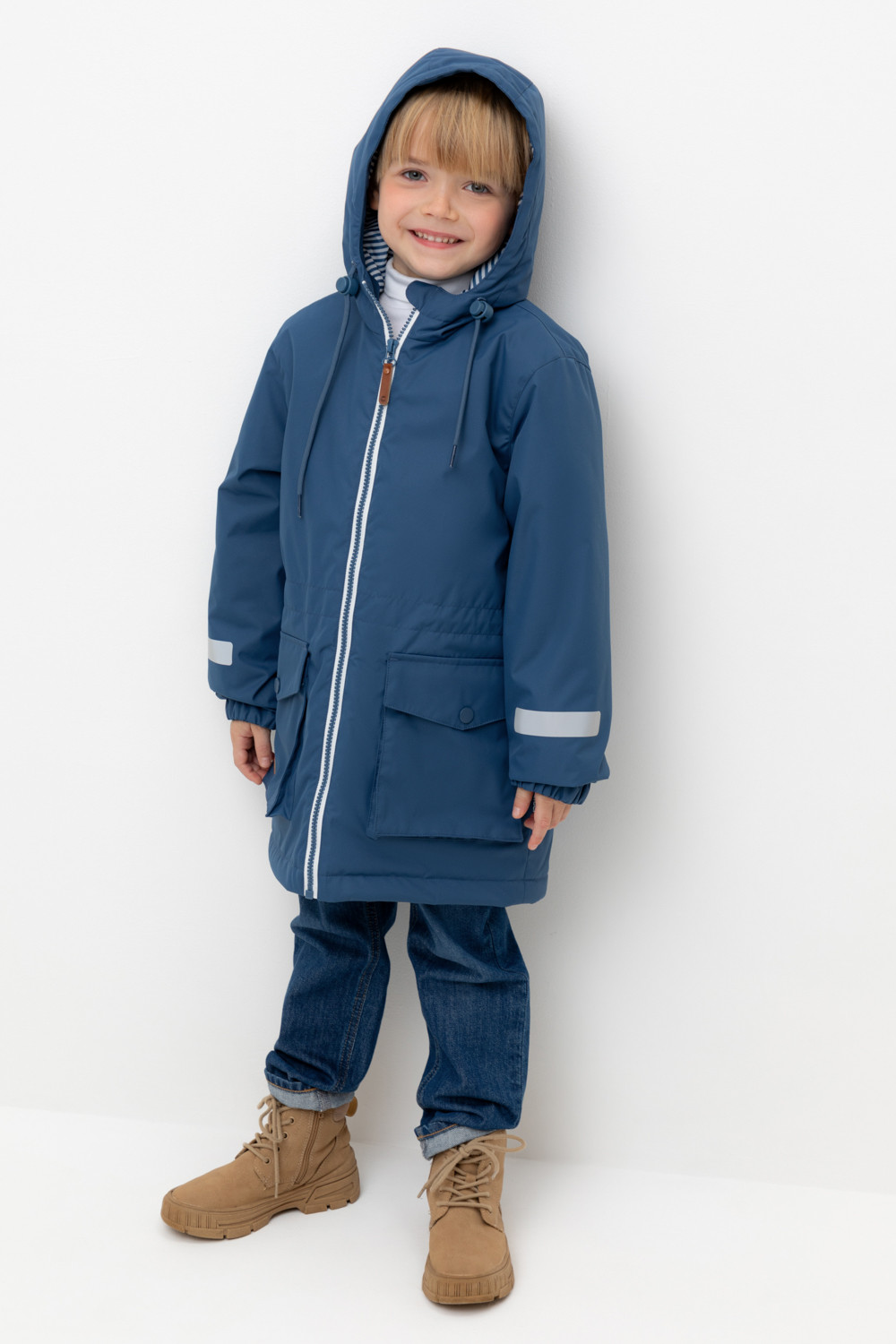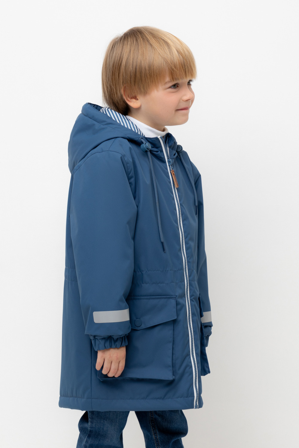 Демисезонная куртка для мальчика с утеплителем SEE®: 120 г/м2. Выполнена из мембранной ткани с дополнительной тефлоновой обработкой. Данный вид обработки предохраняет изделие от загрязнения и лучше отводит влагу. Подклад из 100% полиэстера. У изделия предусмотрена защита подбородка. Несъемный капюшон имеет эластичную утяжку со стопперами. Низ рукавов на эластичной резинке для лучшего прилегания. На талии утяжка при помощи шнура со стопперами. По бокам два накладных кармана с клапанами. Во всех изделиях верхнего ассортимента для безопасности ребенка предусмотрены светоотражающие элементы.